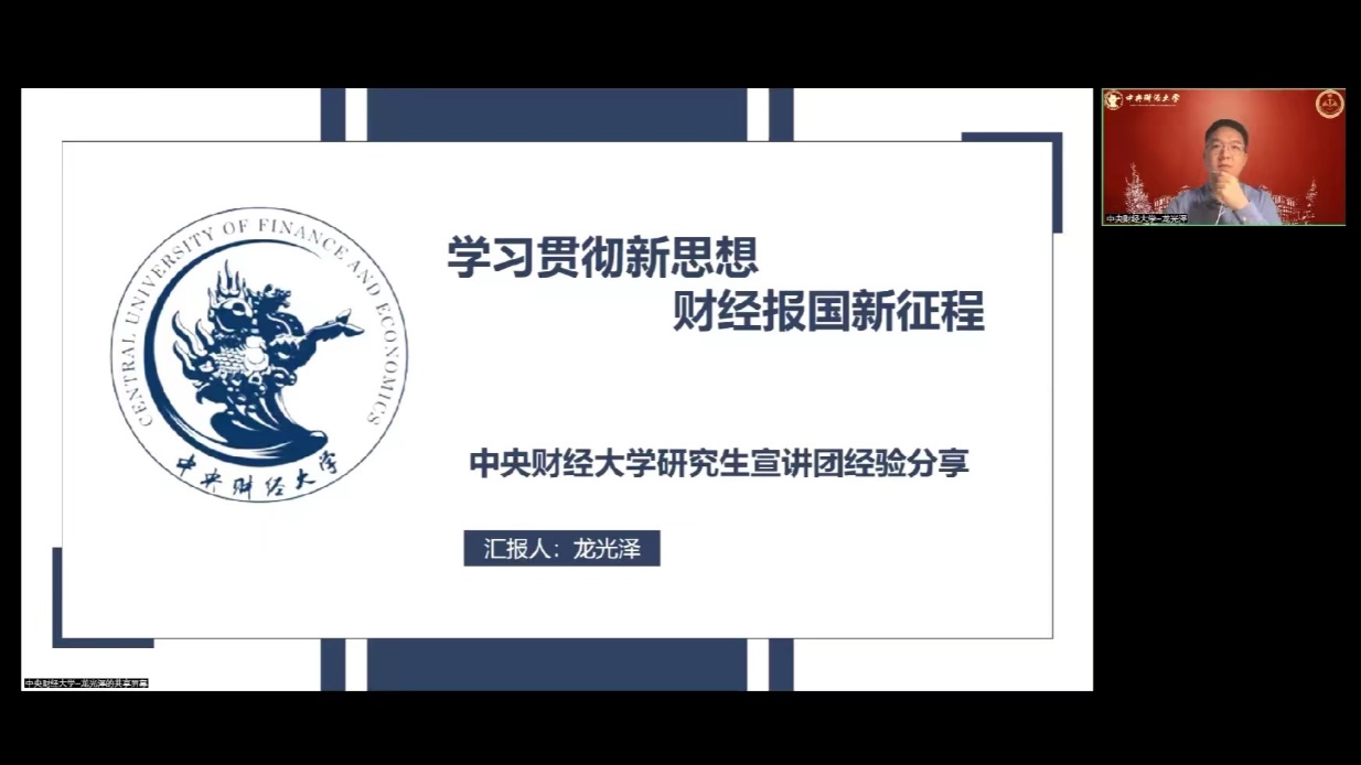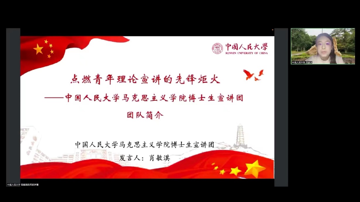 随后,兄弟高校宣讲团代表作宣讲经验分享。中国人民大学马克思主义学院博士生宣讲团团长肖敏淇从“耕耘理论沃土,聚焦时代前沿”“走过山川河流,细说时代新声”“交流互鉴搭平台,宣讲形式更多元”“融合宣讲新模式,梦幻联动出精品”四个方面分享团队“讲、研、学、用”四位一体宣讲模式。四川大学百川青年学生宣讲团团长张婕从建好校院两级宣讲团队、打造特色精品宣讲项目和健全宣讲工作制度三个方面介绍团队具体工作开展情况,建议强化“扩大宣讲覆盖面、创新宣讲内容和形式、夯实宣讲员理论素养和加强与其他高校宣讲团的联学联动”四个着力点来提升宣讲工作实效。中央财经大学研究生宣讲团团长龙光泽围绕“学习贯彻新思想,财经报国新征程”主题,结合高校联合宣讲、乡村振兴社会实践调研和主题教育课程清单三大特色活动,分享了团队将财经专业知识与时事热点、工作学习、生活实际相结合,形成“学以致用、讲学互动、以讲促学”的研究生自我教育和浸润成长成才长效机制的先进经验。