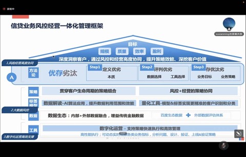 接着,许总向我们阐述了度小满信贷管理理念和体系。度小满信贷业务管理的理念是“大数据驱动、风控经营一体化、目标一致、高度协同”,在满足客户合理需求的基础上,提供有温度的服务,并且重视客户体验。从管理框架来看,度小满管理目标为规模、质量、效率和盈利的协同发展,包括风险经营高度协同、大数据风控以及数字化运营高效支撑。