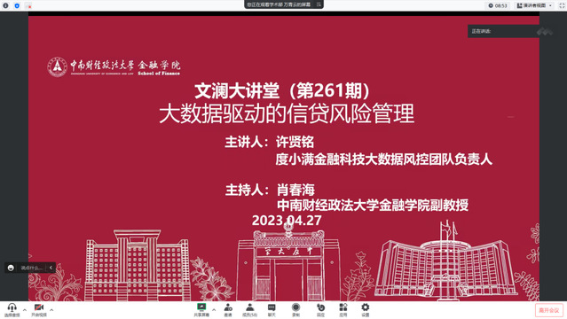 (通讯员 杨雅婷 万青云)4月27日下午14:00,金融学院第261期文澜大讲堂在线上顺利举行。本期讲座分享的主题是“大数据驱动的信贷风险管理”,主持人为金融学院肖春海副教授,主讲人为度小满金融科技大数据风控团队负责人许贤铭,金融学院师生共300余人参与此次论坛。