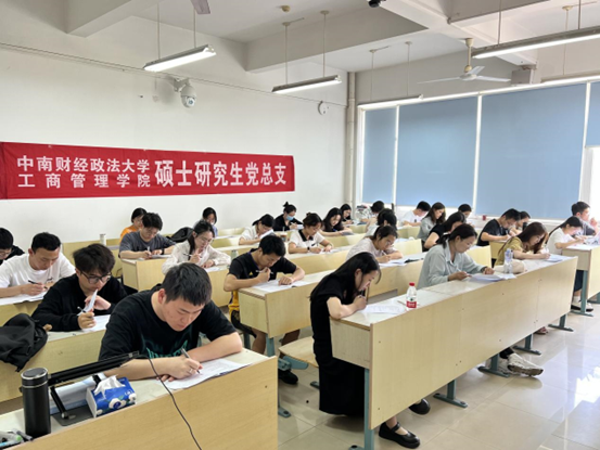 本次知识竞赛初赛以笔试形式进行,考试题型有单选、多选、填空和简答题,题目范围为中国共产党第二十次全国代表大会报告、中国共产党章程(2022年版)、中国共产党党史和中南财经政法大学校史、中南财经政法大学工商管理学院院史等。