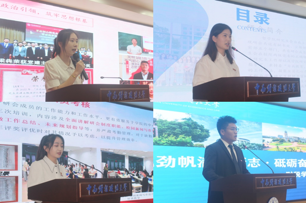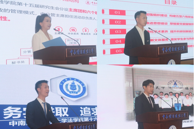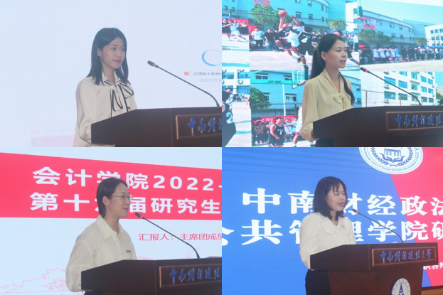 法律硕士教育中心研究生会介绍了在思想建设、组织建设、学术交流、文体实践、生活服务等方面的工作情况,重点汇报了“我们这十年,奋进新时代”主题作品征集活动等工作成果;工商管理学院研究生会深入贯彻 “五育并举·五育融合”研究生品牌方案,展示了围绕“以德研商”“融智汇商”“以体育商”“以美启商”“寓劳于商”五个方面,服务研究生全面发展的工作举措和成效;会计学院研究生会从组织建设有制度、思想建设有高度、学术研讨有深度、宣传联动有维度、生活服务有温度、文体工作有广度六个方面,展现了“以制度为依托、以学术为主体、以文体为两翼”,服务广大研究生全面发展的工作模式;公共管理学院研究生会汇报了“一个主题”“两个关键”“三个抓手”“四方发力”的工作思路,从“以理想为念,永葆奋进姿态”“以人才为音,谱写青春华章”“以责任为基,擦亮服务底色”三方面总结工作成效。