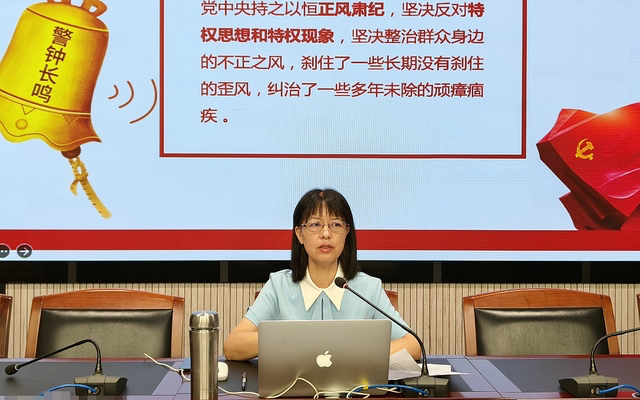 刘琳琳指出,党的二十大报告将“坚定不移全面从严治党,深入推进新时代党的建设新的伟大工程”作为专章部署,充分体现党的建设在党和国家事业发展全局中的核心地位。刘琳琳从1939年毛泽东同志发表《<共产党人>发刊词》、1994年召开党的十四届四中全会和2018年习近平总书记发表重要讲话三个重要时间节点切入,梳理了党的建设历史,并由此论证把党的建设作为一项伟大工程来推进是我们党的一大创举。随后,刘琳琳以详实的数据和生动的案例,从“以‘两个维护’引领全党团结统一,有力保证党中央权威和集中统一领导”“提出和落实新时代党的建设总要求”“以钉钉子精神纠正四风”“开展史无前例的反腐败斗争”四个方面具体介绍新时代党的建设新的伟大工程取得的伟大成就。最后,刘琳琳概括总结了把新时代党的建设新的伟大工程推向新境界的七大举措,即坚持以党的政治建设为统领、坚持以党的科学理论筑牢思想根基、完善党的自我革命制度规范体系、建设堪当民族复兴重任的高素质干部队伍、增强党组织政治功能和组织功能、坚持以严的基调强化正风肃纪、坚决打赢反腐败斗争攻坚战持久战。