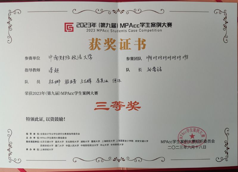 (通讯员 杭慧喆 孙誉铭)2023年6月18日,我国会计专业学位教育领域最具影响力的专业赛事——由全国会计专业学位研究生教育指导委员会指导、中国MPAcc学生案例大赛组委会主办的2023年第九届中国MPAcc学生案例大赛在上海落下帷幕。会计学院(会硕中心)多支队伍在本次案例大赛中表现优异、勇创佳绩,交出了令人满意的答卷。其中,由晏超副教授指导的2022级会计专硕团队“啊对对对对对对098”跻身全国10强并荣获全国三等奖;由王嘉鑫副教授指导的2022级会计专硕团队“茶山刘女子护卫队”获得华中赛区三等奖;由李四海教授指导的2020级本科生团队“发际线和我对抗队”跻身全国20强,荣获全国本科生代表队优胜奖。