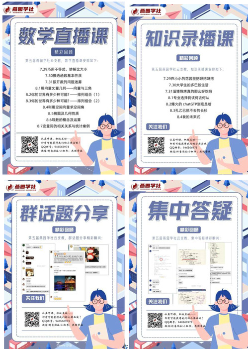 随风深潜入夜,润物悄然无声。除了聚焦于高中数学的直播课程,本次支教亦联系当前社会热点、充分听取学生建议,推出7节录播课、12次集中答疑及4次群话题分享。从探索淄博烧烤爆火的流量密码,到解密孔乙己脱不下的长衫……一节节的课外分享课使得云支教的课程内容更加充实。每晚19:45,当数学直播课与知识录播课结束后,支教团的成员却并不会退出授课直播间。群内的各位同学可以以图片、文字或语音的方式,就假期作业的难点自由地向支教团的各位老师提问。以助教老师为核心解答人,其余成员为助力解答人的答疑团队将针对每一位同学的疑问给出尽可能详细的回答。4次群话题,涉及假期生活、你梦想中的大学生活、秋天的第一杯奶茶等多方面内容,给紧张的高中生活加点趣味的同时,也拉近支教团成员与各位学生之间的距离。