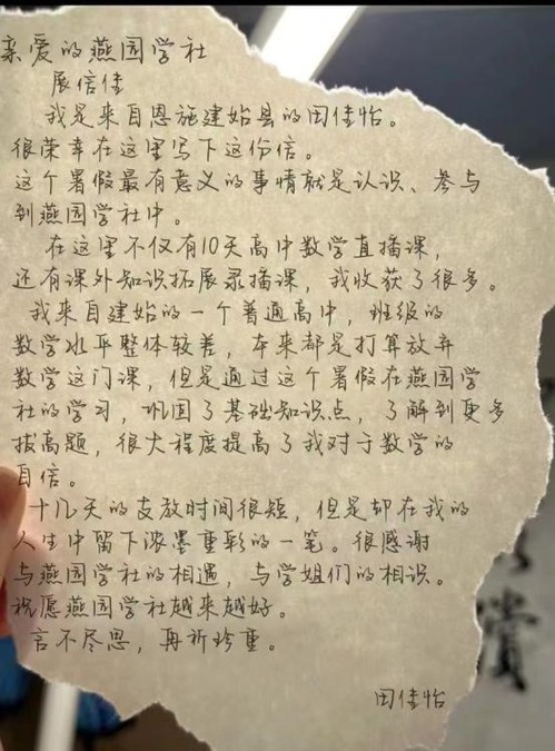 (通讯员:舒永芳 陈元)8月22日,燕园学社收到了这样一封来信:“亲爱的燕园学社,展信佳,我来自恩施自治州建始县,很荣幸在这里写下这封信。这个暑假最有意义的事情就是认识、参与到燕园学社云支教当中……”这封信来自第五届燕园学社云支教的线上听课同学田佳仪。