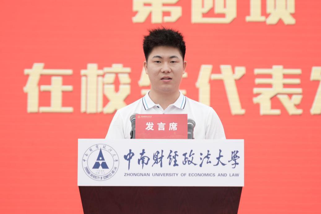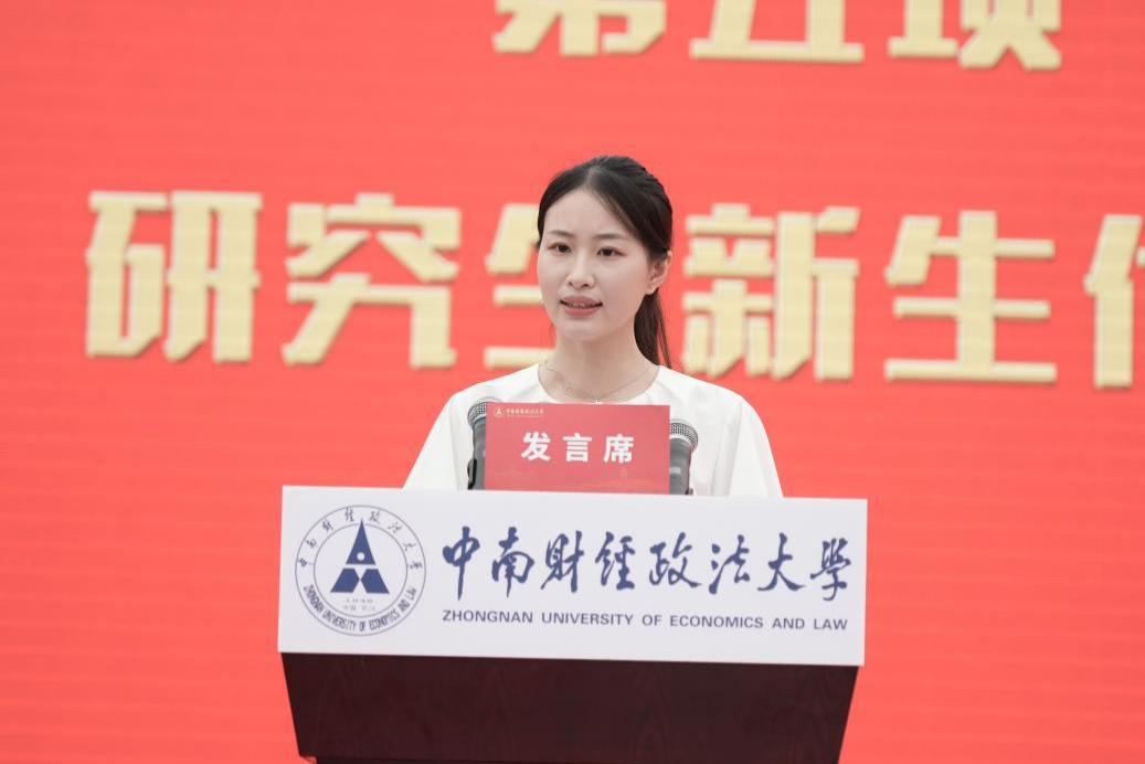 第39届校研究生会主席团成员、马克思主义学院2021级马克思主义与中国经济社会发展专业博士研究生王子秦作为在校研究生代表发言。他回顾了两年前入校时开学典礼上杨校长的殷切寄语,结合自身科研经历表示,研究生既要读好丰富的“有字之书”,也要践行广博的“无字之书”,在实践中检验所学、锤炼本领。他鼓励同学们心怀“国之大者”“校之大计”,为把我校建成“财经政法深度融通色鲜明的世界一流大学”贡献智慧和力量。