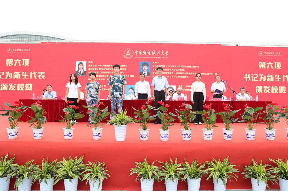 校徽是一所学校办学理念与人文内涵的标志符号,是凝心聚力的有效载体,是学校办学历史的形象体现。在典礼上,侯振发书记为来自金融学院2023级金融学专业硕士研究生雷娟,法与经济学院2023级法与经济学专业硕士研究生吴骄洋,哲学院2023级本科生蔡宇程,法学院2023级本科生邓雅丹及经济学院厄瓜多尔籍本科生李菲颁发中南财经政法大学校徽。他们将带着学校的殷切期望开启求学生涯,感受中南大跨越75年的风雨历程,体悟学校深厚的精神文化底蕴,传承中南大鲜明的红色基因。