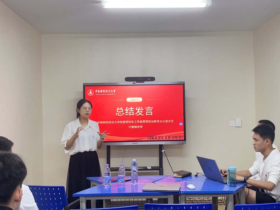 最后,付老师结合整体的宣讲情况和自我点评情况对本次备课会进行总结。付老师首先对八位宣讲成员用心宣讲、扎实备课的行为予以肯定,表明本次备课会以批评为主,“辣”味很足,是一场真实且力求向更好发展的备课会,希望同学们在会后结合修改意见反复打磨宣讲稿并鼓励大家做到“上接天线,下接地气”以便达到更好的宣讲效果。