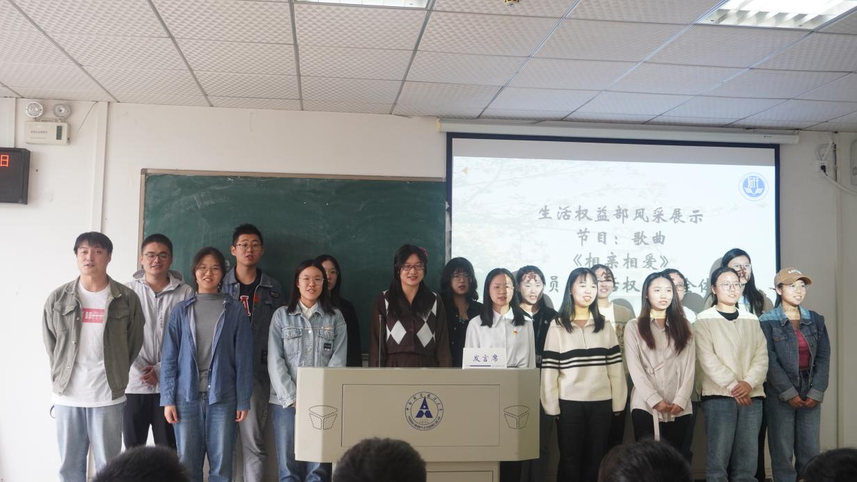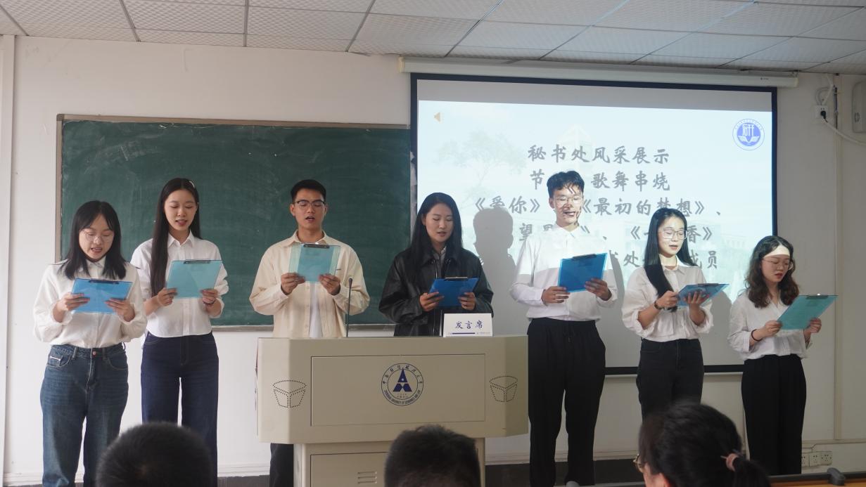 发言结束后,各部门成员进行风采展示。秘书处同学们的歌舞串烧节奏明快,瞬间点燃了大家的激情,学术部同学们带来的歌曲《如愿》彰显了当代青年愿当炬火承担时代重任的使命与担当,文体部同学们动感的舞蹈串烧热情洋溢,将现场气氛推向高潮,随后大家的思绪又被宣传部同学们演唱的《晴天》带回青葱校园。最后,风采展演在生活权益部动听的歌曲《相亲相爱》、联络服务部同学优美的诗朗诵《水调歌头》和《春江花月夜》中完美收尾。各部门的展示形式多样、精彩纷呈,彰显出了新一届校研究生会新成员们的蓬勃朝气。