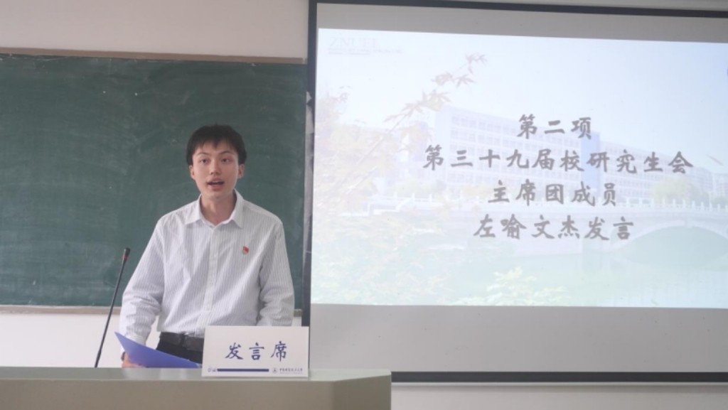 第三十九届校研究生会主席团成员代表左喻文杰发言。他代表校研究生会对新成员的加入表示欢迎,对校研究生会的工作宗旨及工作职责进行介绍。他从工作态度和工作方法为大家分享工作经验,鼓励与会全体成员共同筑牢思想信仰之基,恪守奋斗律己初心,努力完善和自觉执行各项规章制度,多总结常反思,在工作中提高效率提升质量,并期待与新成员们一道精诚团结,共同成长。