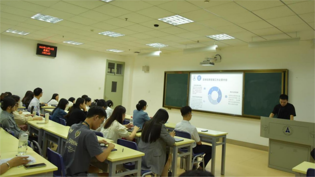 随后,协会主要负责人依次上台发言。研心协副会长徐乐童同学围绕社团的成立背景、目的宗旨、组织架构、品牌活动、发展规划等进行了阐述;团支书胡旭轩同学就主题团日活动安排及财务工作相关要求进行了简要说明。