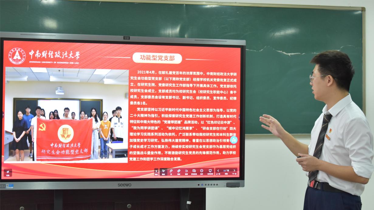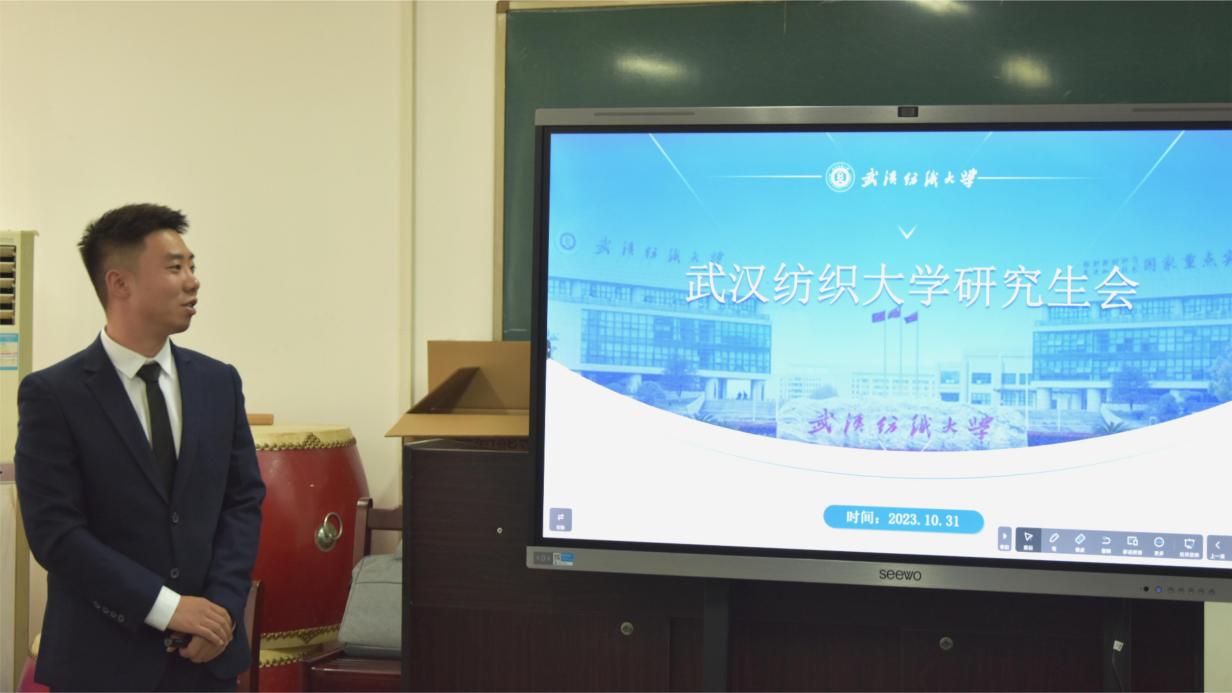 会议第三项,武汉纺织大学研究生会执行主席于振凯从组织架构、人员职责和工作开展三个方面介绍该校研究生会具体情况。他重点分享了习近平新时代中国特色社会主义思想宣讲比赛、研究生英语口语大赛、“精彩研续”系列文体赛事、毕业季文化衫设计等各项特色活动,并期待加强两校研究生会的沟通互联,打造更高效、更具凝聚力的研究生会。