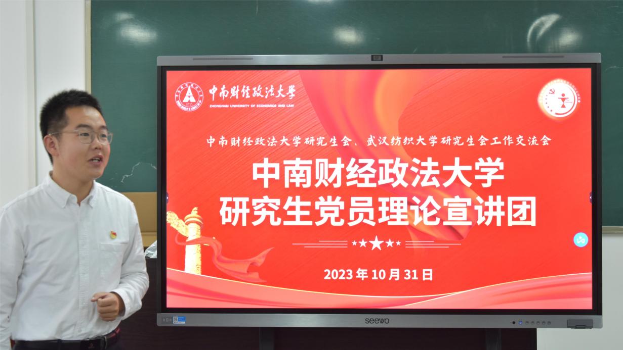(通讯员 陈芷姗 文秋霖 孙逸芳 摄影 崔倩茗)为加强校际研究生组织工作交流,2023年10月31日上午,我校研究生会、研究生党员理论宣讲团与武汉纺织大学研究生会代表在中南财经政法大学南湖校区文添楼106室开展工作交流会。交流会以“交流学习共进步、携手与共‘织’未来”为主题,旨在加强高校研究生组织间深度联动、互鉴经验,进一步完善研究生组织工作与建设。