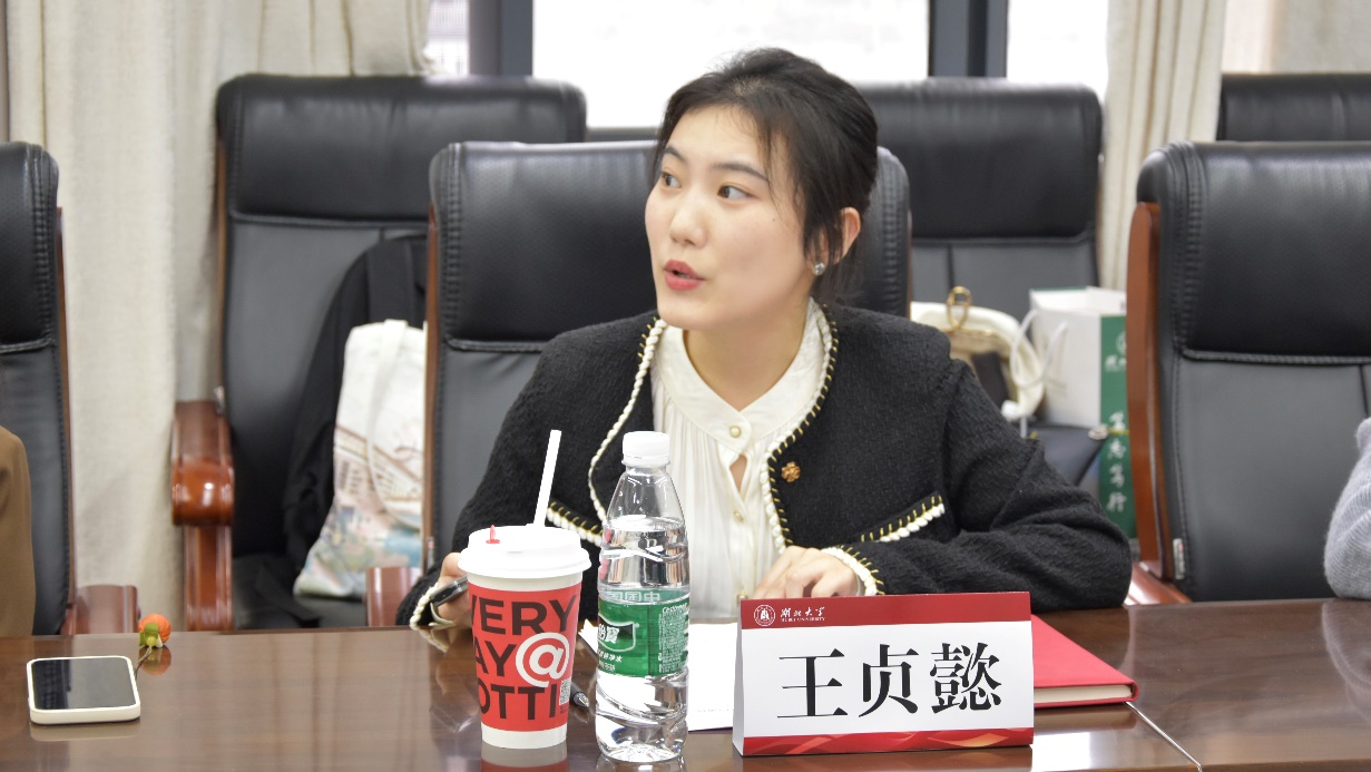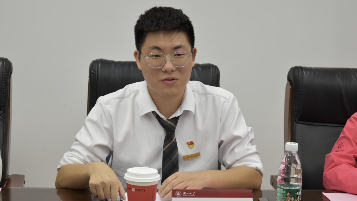 会议第一项,湖北大学“青马”宣讲团团长王贞懿对我校研究生会的来访表示欢迎。她以“青年之力,宣时代之声”为主题,向与会代表介绍湖北大学马克思主义学院“青马”宣讲团具体情况,分享团队在理论学习、校际交流、校内宣讲、校外实践等四个维度的工作进展。