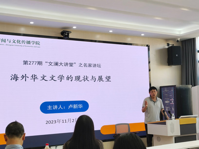讲座伊始,卢新华教授简要谈及自己对海外华文文学的认识。他认为,海外华文文学的创作不易,但海外华文作家将过去的本土生活与海外生活进行对比,碰撞出新的火花,进行文化创新,产生了许多出类拔萃的作品。