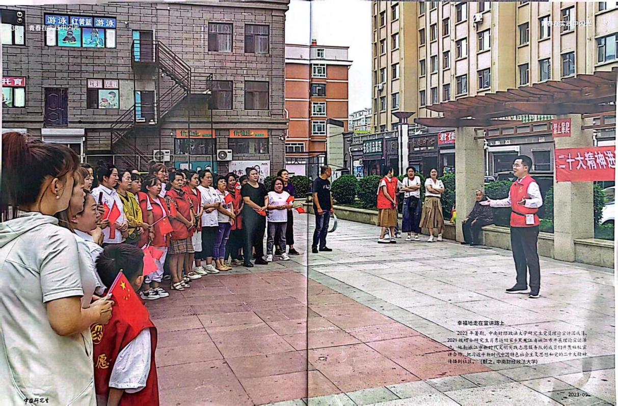 (通讯员 付慧娟 陈梦洁)近日,学校研究生党员理论宣讲团副团长、2021级法学院硕士研究生肖勇于家乡黑龙江省嫩江市开展宣讲活动的照片《幸福地走在宣讲路上》被《中国研究生》杂志2023年第9期“青春在实践中闪光”专栏刊载。