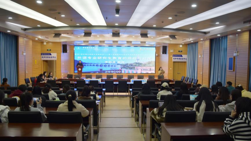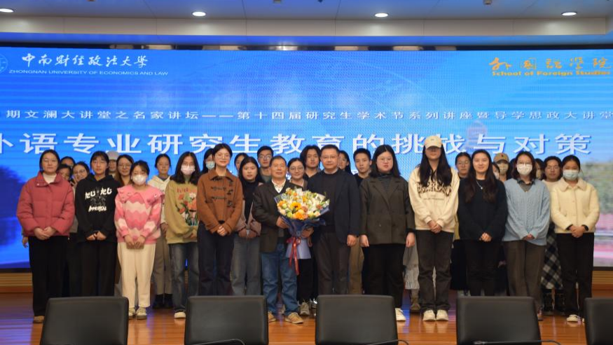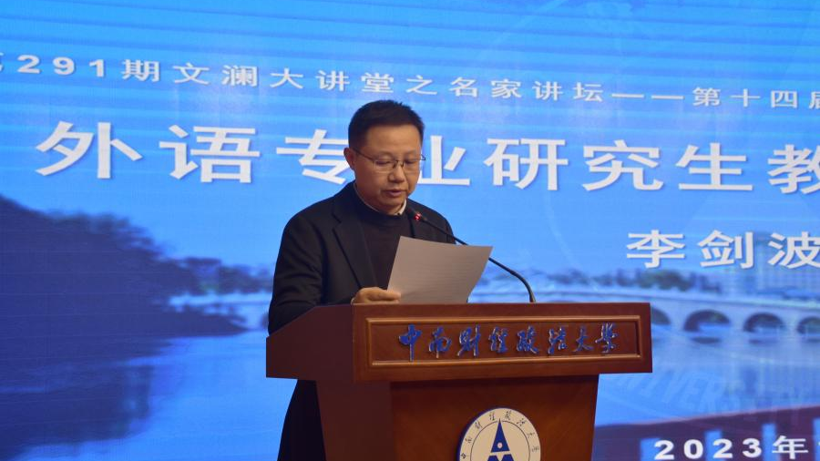 (通讯员 张冉 金然 章郁海)2023年12月7日下午,由研究生院、党委研究生工作部、校研究生会主办,外国语学院研究生会承办的第291期“文澜大讲堂”之名家讲坛——第十四届研究生学术节系列讲座在文澴楼同声传译会议中心开讲。本次讲座以“外语专业研究生教育的挑战与对策”为主题,邀请了外国语学院李剑波教授担任主讲人。讲座由外国语学院袁奇副院长主持,学院2023级全体研究生到场聆听。