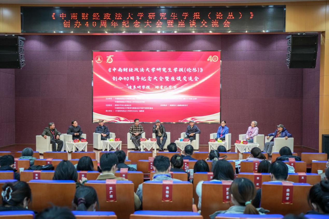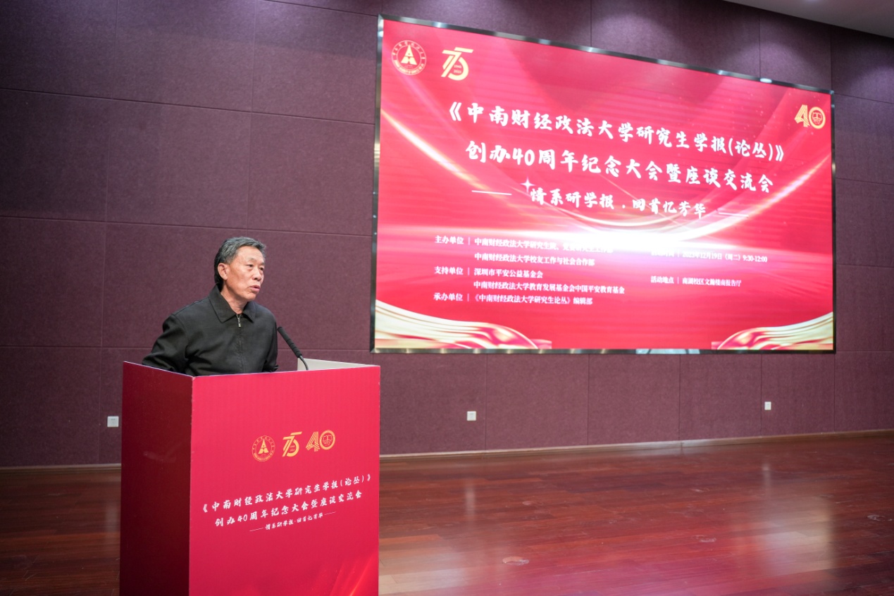 (通讯员 付慧娟 陈梦洁 谢虹敏 潘紫青)2023年12月19日,《中南财经政法大学研究生学报(论丛)》创办40周年纪念会议在我校南湖校区举行。今年是学校建校75周年,本次大会作为75周年校庆活动的收官之作,以“情系研学报,回首忆芳华”为主题,特邀《研学报(论丛)》首期收录文章作者代表、创始期编委会成员代表、历届编委会成员代表齐聚一堂,回顾风雨历程,同忆青春岁月,共谋未来发展。