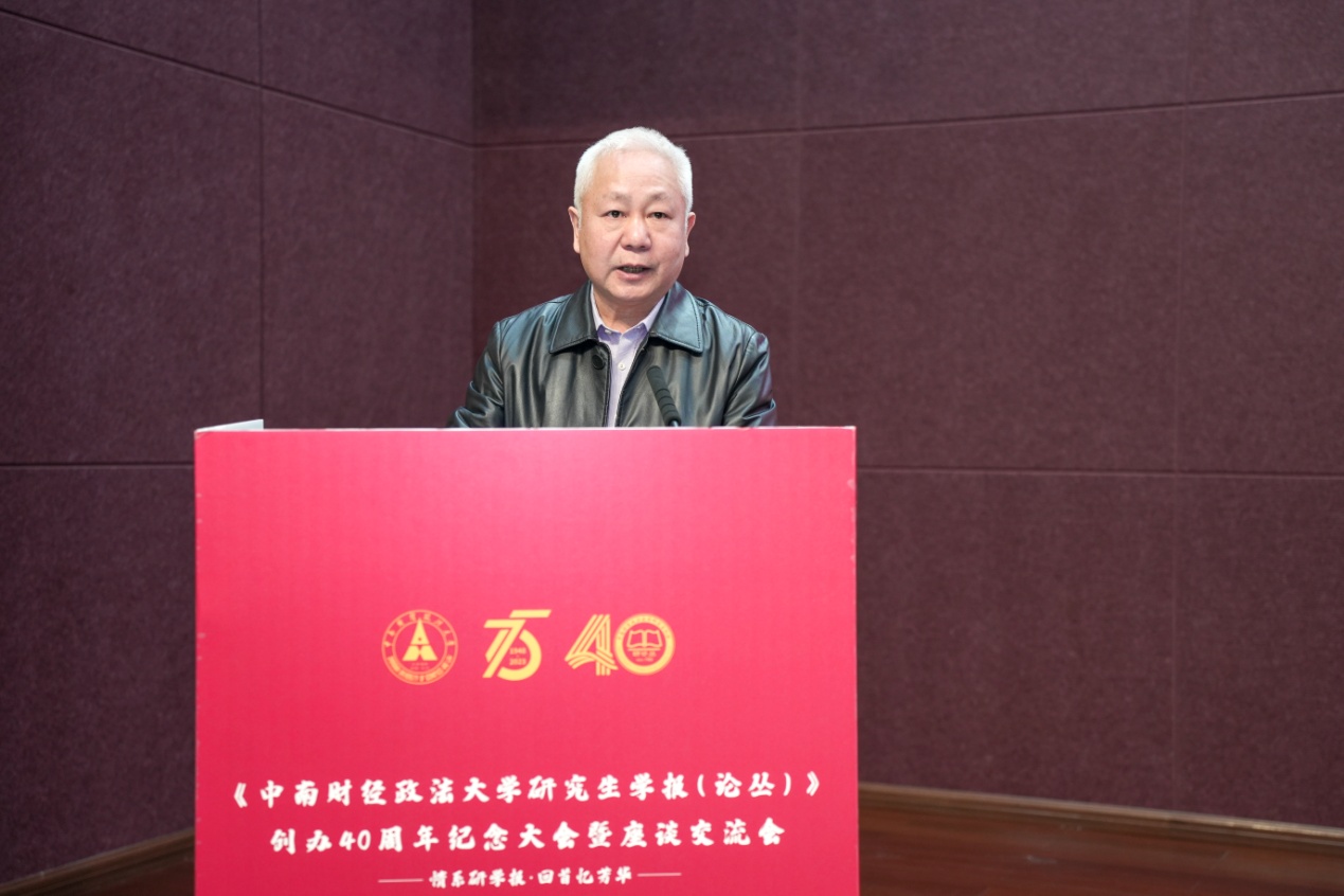 学校校长、党委副书记杨灿明教授代表学校致辞。杨灿明校长对出席纪念大会的特邀嘉宾表示感谢和欢迎,并回顾了《研学报(论丛)》自1983年湖北财经学院时期创办以来的发展历程,肯定了《研学报(论丛)》在引领研究生围绕国家重大战略需求和地方经济社会发展需要,产出兼具理论深度和实践厚度的作品等方面的积极作用。杨灿明校长希望《研论丛》以创办40周年为契机,深入学习习近平新时代中国特色社会主义思想,总结历史发展过程中的成果和经验,把握宣传思想文化工作新要求、着力把脉研究生群体新需求、主动适应媒介技术新变革,以公开出版《研论丛》精华集为新的契机,持续将《研论丛》打造为深受广大研究生欢迎、推崇的学术交流和科研探索园地,力争建成高水平学术集刊。