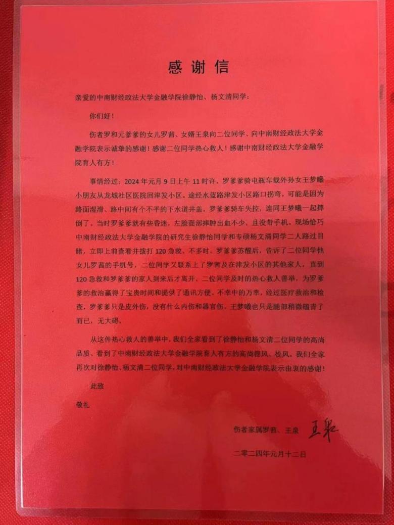 感谢信中热心救人的是我校金融学院2023级金融工程硕士研究生徐静怡和2023级金融专业硕士研究生杨文清。