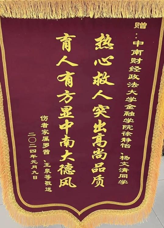 近日,我校收到一面锦旗和一封感谢信,“热心救人突出高尚品质,育人有方显中南大德风。感谢中南财经政法大学金融学院研究生徐静怡和杨文清两位同学热心救人,临危不惧,施以援手,为不慎骑车摔伤的罗爹爹的救治赢得了宝贵时间、提供了通讯方便,避免了可能发生的严重后果。”