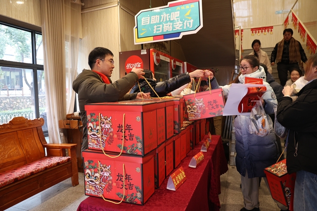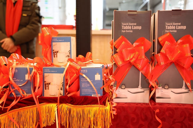 现场张灯结彩、热闹喜庆、暖意融融。吉祥的“福”字、喜庆的拉花、火红的中国结、精美的新春礼包……无不洋溢着欢乐祥和的节日气氛。