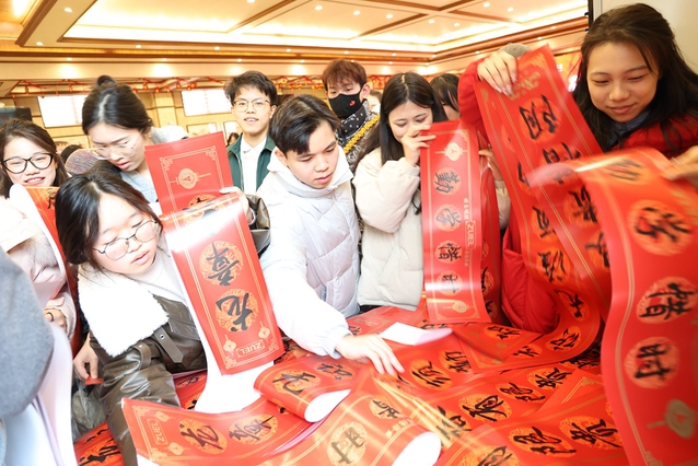学校还给留校学生发放新春礼包,礼包中有:春联、“福”字以及糖果、坚果、瓜子、饼干等零食。同学们纷纷表示:“在学校过春节是一份独特的记忆,虽然没能回家和家人一起团聚,但是团拜会让我们感受到了浓浓的年味儿,学校的关心关怀、服务保障让我们体会到别样的幸福和温暖,留校过年并不孤单。”