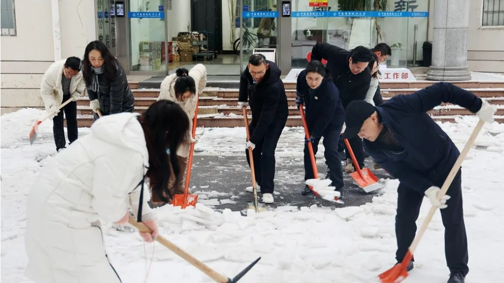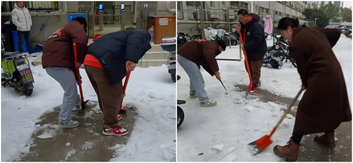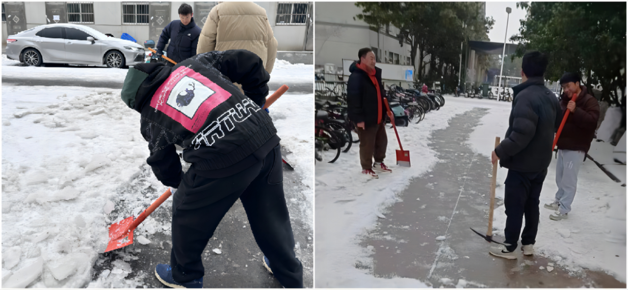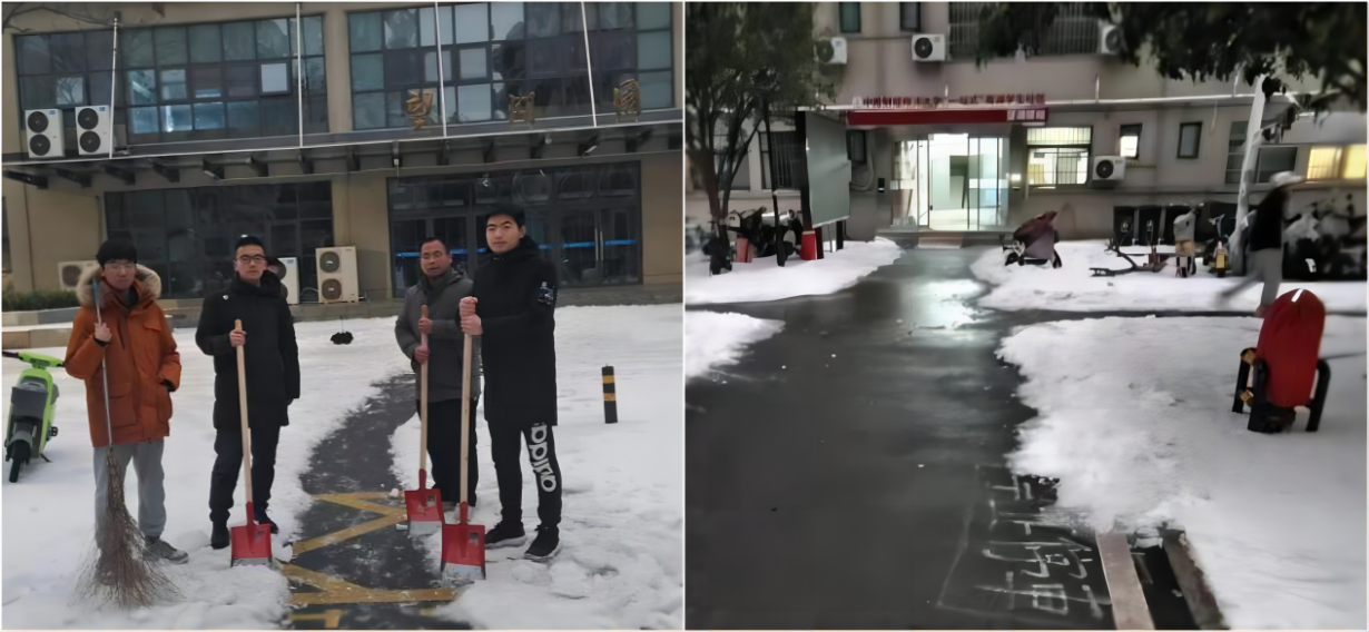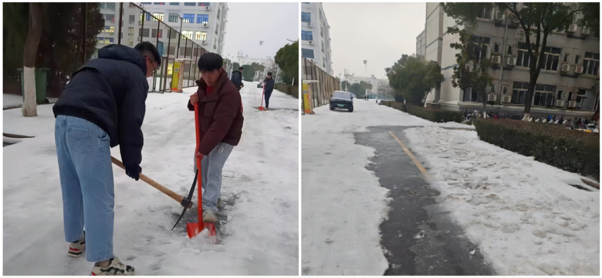 汗水融冰雪,行动传温情。师生们默契配合的身影在寒风中构成了一道靓丽的风景线,他们有序高效地清除了堆积在校园主干道、学生宿舍楼门口的冰雪,取而代之的是一条条“暖心通道”,他们用“党徽红”融化了校园的“冰雪白”。大家在扫雪除冰行动中亦感受劳动光荣的价值和意义,大家纷纷表示自己上了一堂生动的劳动教育课。
