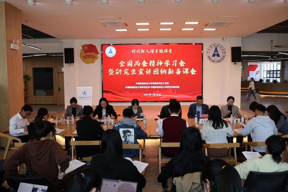 (通讯员 付慧娟 黄丽琼 彭佩凡 摄影 彭佩凡)为深入学习贯彻2024年全国两会精神,进一步推动研究生思想政治教育工作创新发展,选拔和培养一批政治立场坚定、业务能力突出的研究生宣讲人才,2024年3月29日,党委研究生工作部举办的题为“两会精神学思讲,砥砺前行勇担当”的时代新人培育微课堂在大学生素质教育中心路演厅正式开讲,师生共学全国两会精神并开展2024年度研究生宣讲团纳新备课试讲工作。党委研究生工作部肖翠祥部长、马克思主义学院荣枢副院长、法学院侯卓教授、党委研究生工作部李芳副部长、党委研究生工作部付慧娟、黄丽琼老师以及社区兼职辅导员张景瑜、刘桐、李绪莹老师出席。校研究生会党支部成员、研究生宣讲团代表参加会议。