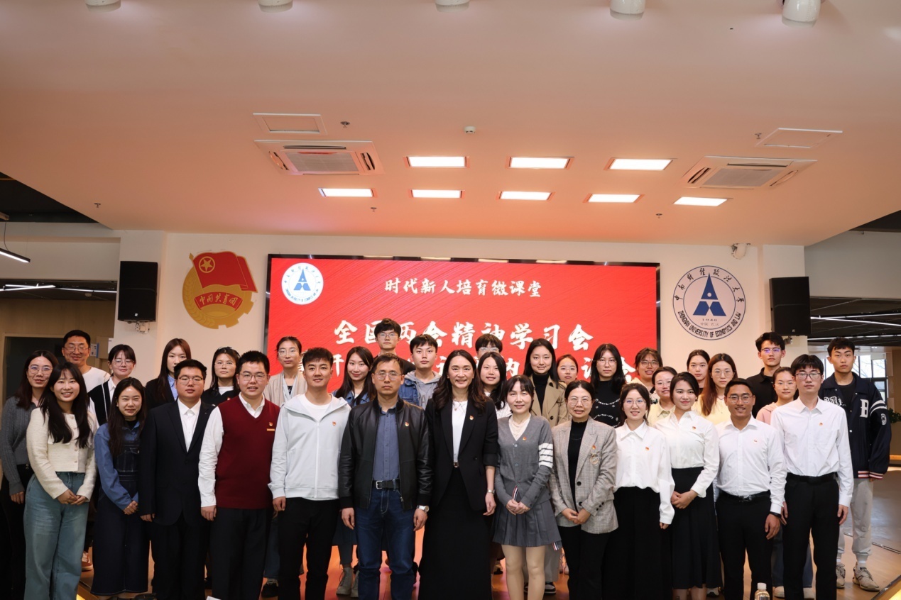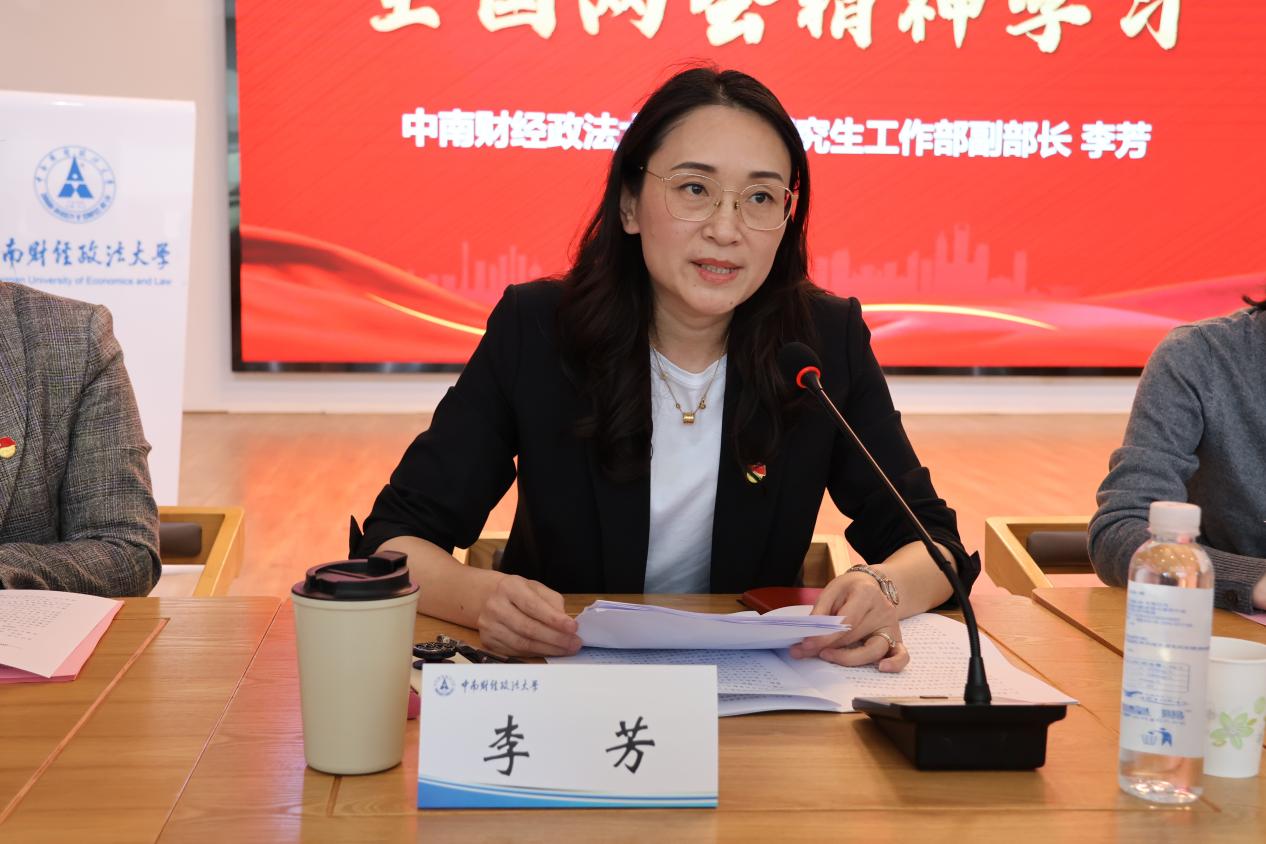 在学习环节,李芳副部长聚焦深化高等教育综合改革、推动产学研用协同发展、完善拔尖创新人才培养机制三方面,为大家解读全国两会关于“深入实施科教兴国战略”的部署,引导大家深刻领会两会精神的时代内涵和具体要求。校研究生会主席团成员代表左喻文杰和研究生宣讲团成员代表肖勇结合自己的专业,分别围绕“新质生产力”和“国务院组织法首次修订”,与大家共同阐释、学习全国两会精神。