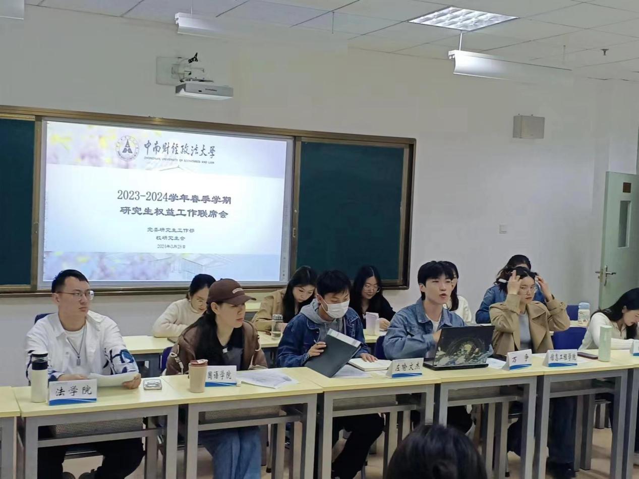 (摄影:刘博彧)为切实做好校院两级研究生组织的权益服务工作,提升研究生骨干为同学办实事的能力和本领,2024年3月28日晚,2023—2024学年春季学期校院两级研究生会权益工作联席会议在文澴楼515召开,校院两级研究生会权益工作负责人参加会议。会议由校研究生会主席团成员左喻文杰主持。