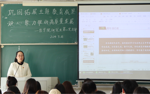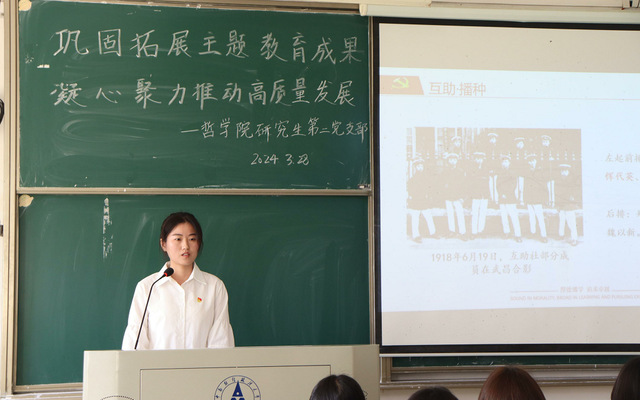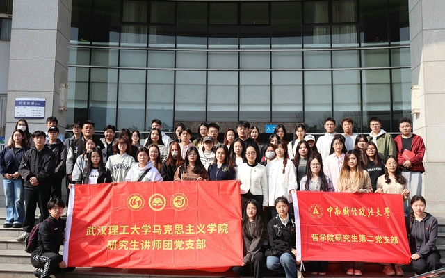 (通讯员 唐烨)为巩固扩展学习贯彻习近平新时代中国特色社会主义思想主题教育成果,进一步加强党支部建设,激发党支部活力,3月28日下午,哲学院研究生第二党支部与武汉理工大学马克思主义学院研究生讲师团党支部在文添楼202教室组织开展3月主题党日联学联建活动。活动主题为“巩固拓展主题教育成果,凝心聚力推动高质量发展”,由哲学院研究生第二党支部组织委员王晨晨主持,支部全体成员和武汉理工大学研究生讲师团成员共同参加。