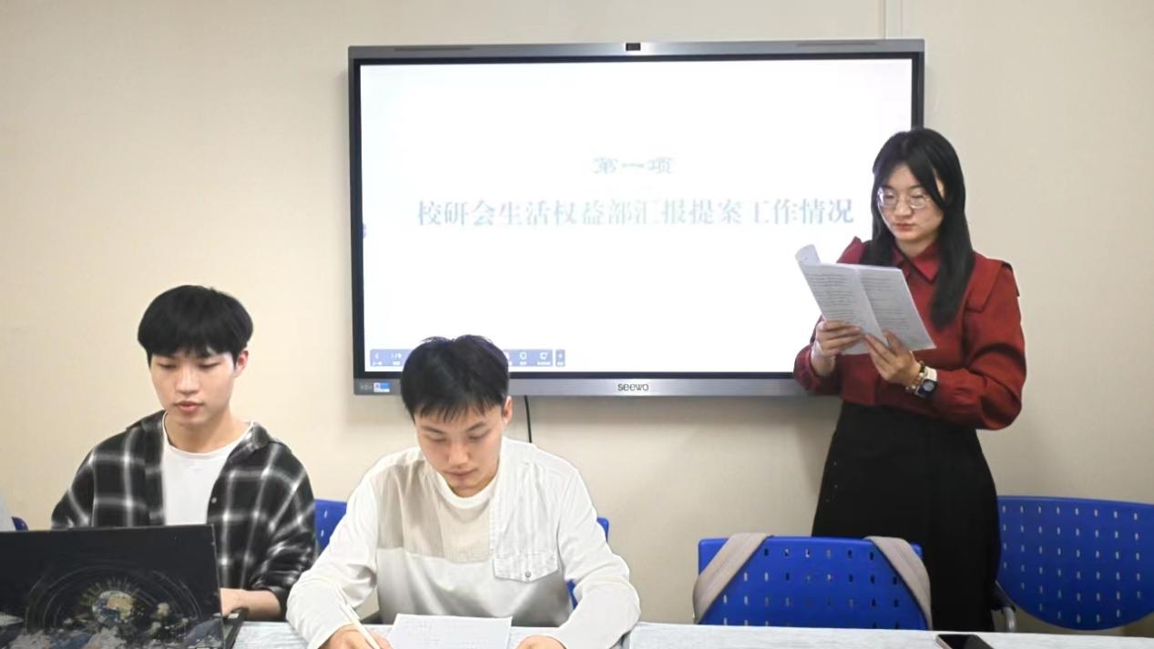 会议第二项,各学院(中心)研究生代表就提案收集过程中的问题展开交流讨论。财政税务学院、工商管理学院、公共管理学院、法学院、金融学院、经济学院等学院(中心)的研究生代表重点分享了研究生群体反馈较多的典型提案。