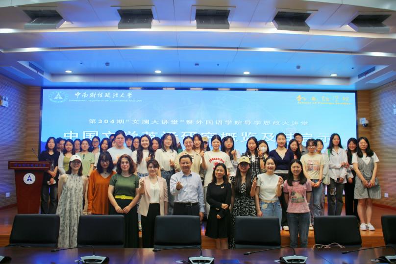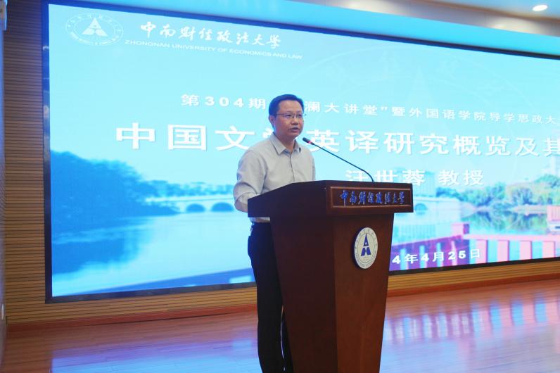 (通讯员 张冉 金然 章郁海)2024年4月25日14:30,中南财经政法大学第304期“文澜大讲堂”暨外国语学院导学思政大讲堂在文澴楼同声传译会议中心开讲。本次讲座邀请学院翻译硕士导师组副组长汪世蓉教授担任主讲人,主题为“中国文学英译研究概览及其启示”。学院副院长袁奇、党委副书记白玉和研工办主任张冉出席活动,2022级、2023级研究生到场聆听。讲座由袁奇主持。