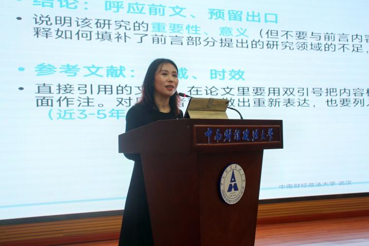 在此基础上,汪教授对文学翻译类学术论文策略进行了指导及经验分享。她提出“新视角/新方法/新对象+主题”的选题方法,辅以各类文学研究论文讲解说明;强调摘要应精准、完整,引言需突出问题,小标题需逻辑清晰;指出结论应呼应前文、预留出口,参考文献应具有权威性和时效性。