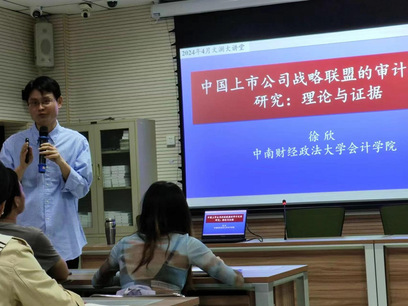 (通讯员:王誉希 孙天浩 邱雨霏) 4月26日上午10:00,由中南财经政法大学研究生院、党委工作部和校研究生会主办,会计学院研究生会承办的第305期“文澜大讲堂”之名家讲坛活动在文泉楼601举行。本次讲座由会计学院徐欣教授主讲,讲座主题为“中国上市公司战略联盟的审计定价研究:理论与证据”。