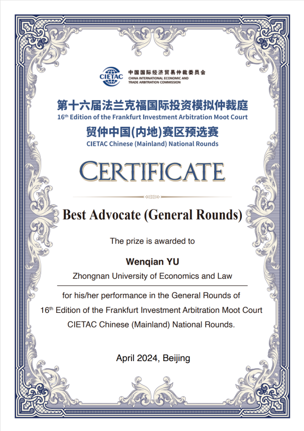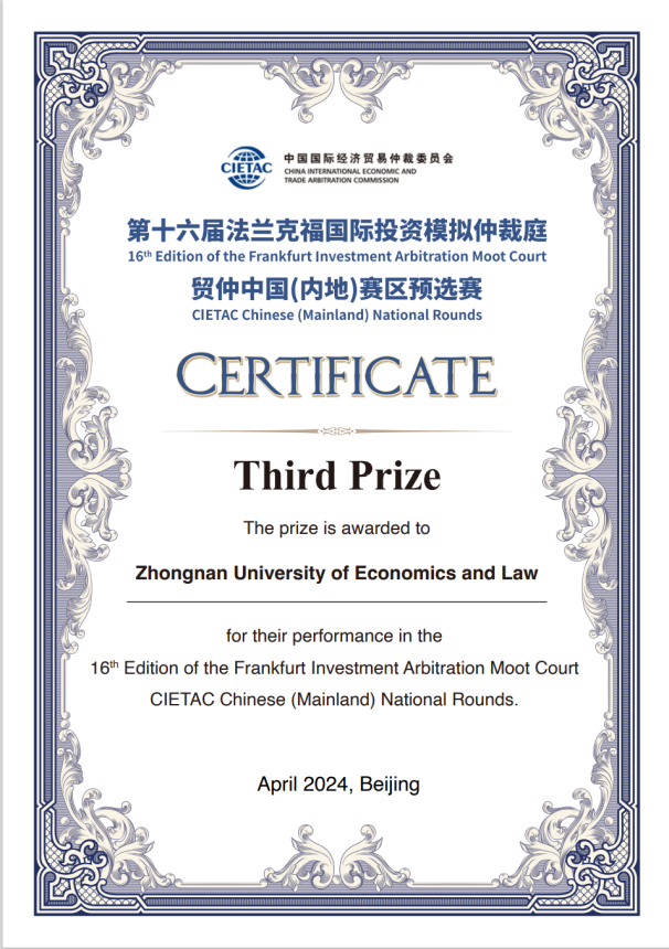 (通讯员 周诗琪 余汶倩)4月12日,由中国国际经济贸易仲裁委员会主办的第十六届法兰克福国际投资模拟仲裁庭-贸仲中国(内地)赛区预选赛圆满结束,我校代表队荣获全国三等奖,法律硕士教育中心23国际仲裁班余汶倩获“最佳辩手”称号。