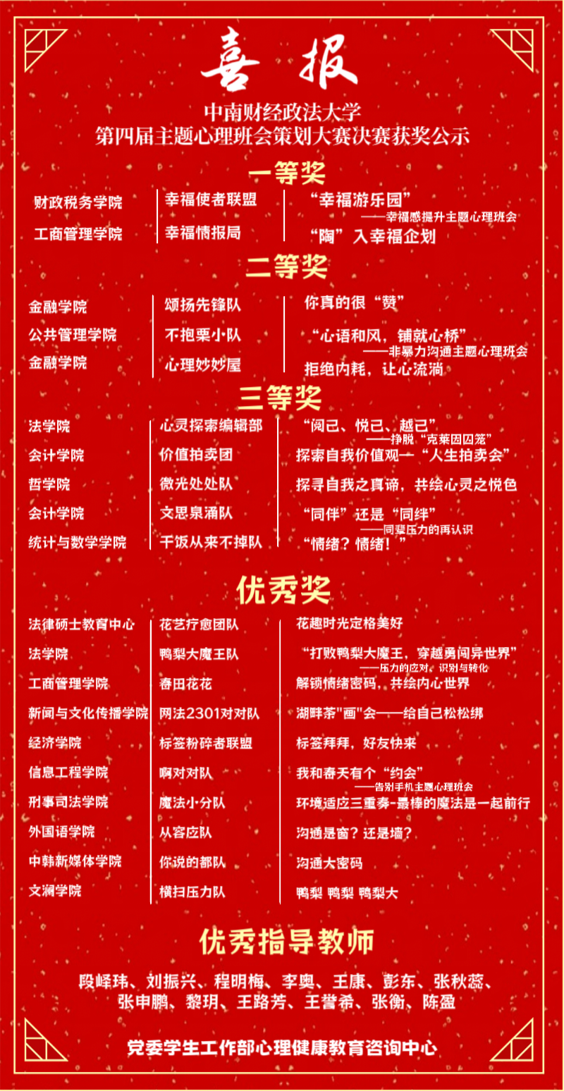 (通讯员 付慧娟 黄丽琼 付祥雪)2024年5月27日,学校第四届主题心理班会策划大赛获奖名单公布。依据各团队的材料评分、答辩专家评分和大众评审评分的综合情况,4支研究生队伍在本次大赛中获得佳绩。其中,来自法学院的心灵探索编辑部团队、哲学院的微光处处队、会计学院的文思泉涌队三支研究生队伍荣获三等奖,来自法律硕士教育中心的花艺疗愈团队获得优秀奖,研究生辅导员老师张秋蕊、张申鹏、王路芳、王誉希获得“优秀指导教师”称号。