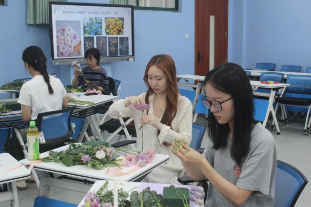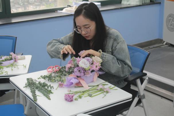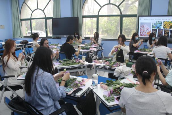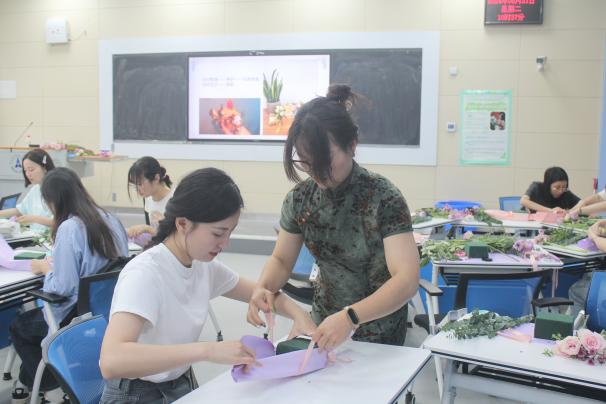 活动伊始,杨雪老师为师生们带来了一场精彩的插花技巧讲座。她从花卉选择、颜色搭配、造型设计等角度进行了生动的讲解,并简要介绍了中西方插花艺术的差异,让在场师生们对插花艺术有了更深的认识。
