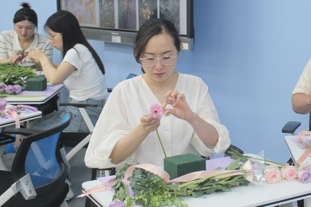在花材剪切技巧的细致讲解后,师生们开始了自己的插花创作。活动现场气氛热烈,参与者们或专注挑选花朵,或热烈讨论技巧,或认真修剪枝叶,每个人都在用自己的方式诠释对插花艺术的理解和热爱。