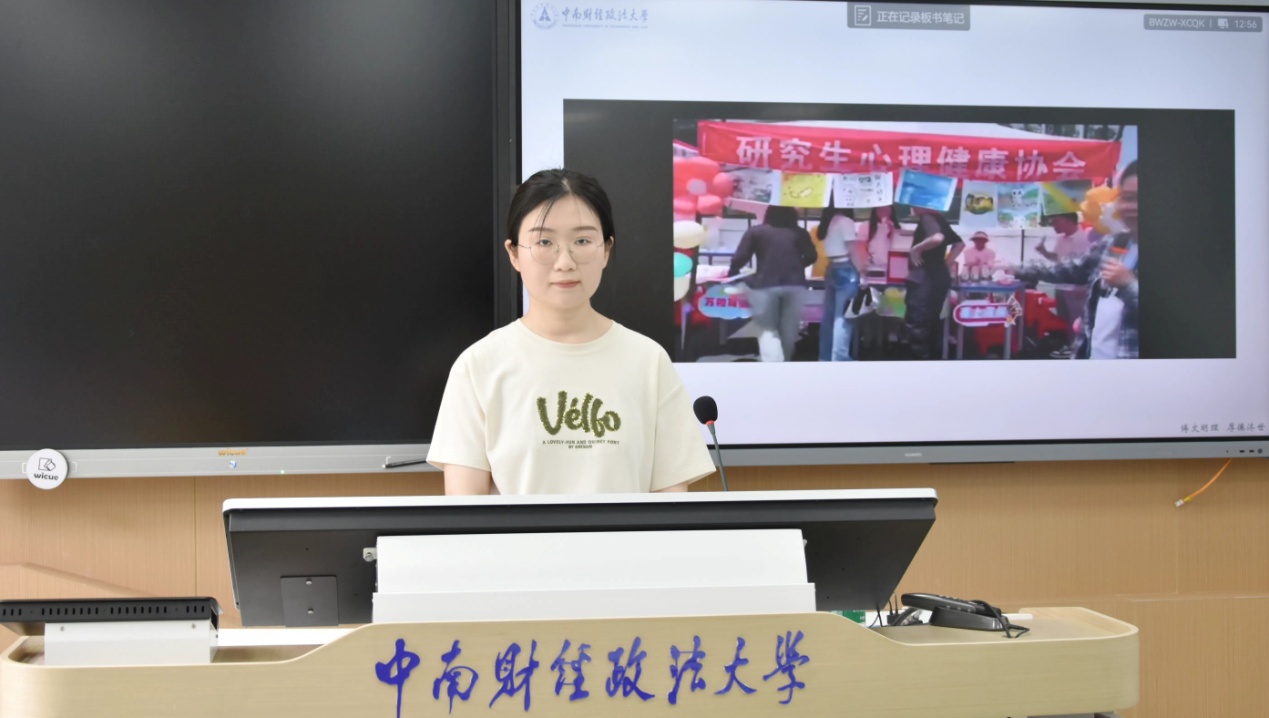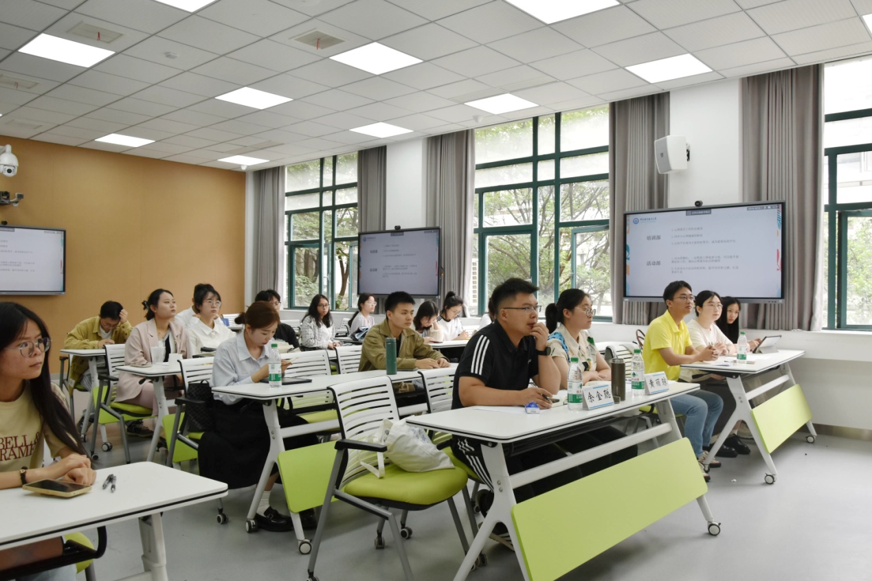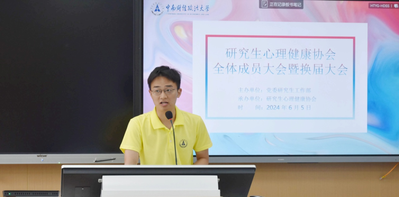 (通讯员 黄丽琼 付祥雪 摄影 时伊贝宁)为推动研究生心理健康协会健康发展,健全和完善社团运行机制,进一步调动社团成员积极性,6月5日下午,研究生心理健康协会(以下简称研心协)在文波楼智慧教室205举行2023-2024学年全体成员大会暨换届大会。心理健康教育咨询中心专职教师、研心协指导教师余金聪副教授,党委研究生工作部思政办黄丽琼老师出席大会。