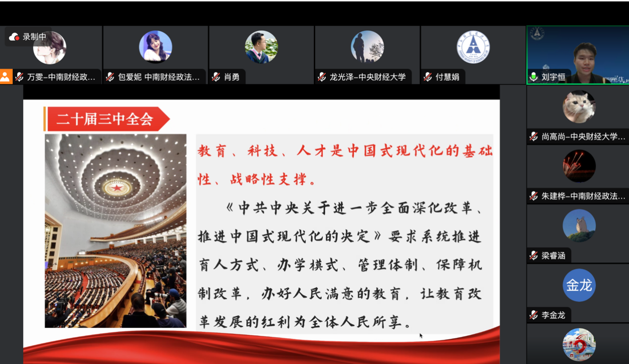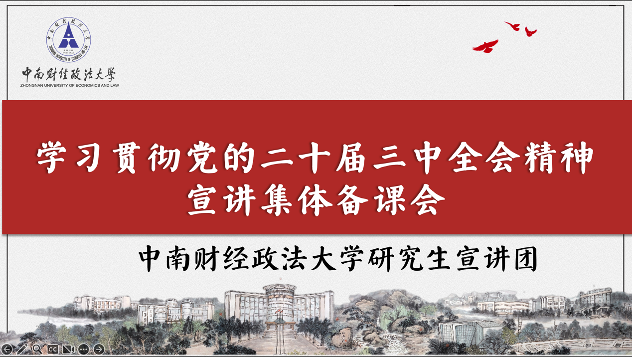 (通讯员 刘宇恒)为深入学习宣传贯彻党的二十届三中全会精神,做好新生入学教育系列课程备课准备,中南财经政法大学研究生宣讲团于8月10日晚以线上方式召开集体备课会。会议邀请了中央财经大学研究生宣讲团与华中师范大学习近平新时代中国特色社会主义思想学生研习社代表出席,特邀学校党委研究生工作部主任付慧娟老师做指导。会议由中南大研究生宣讲团团长万雯主持。