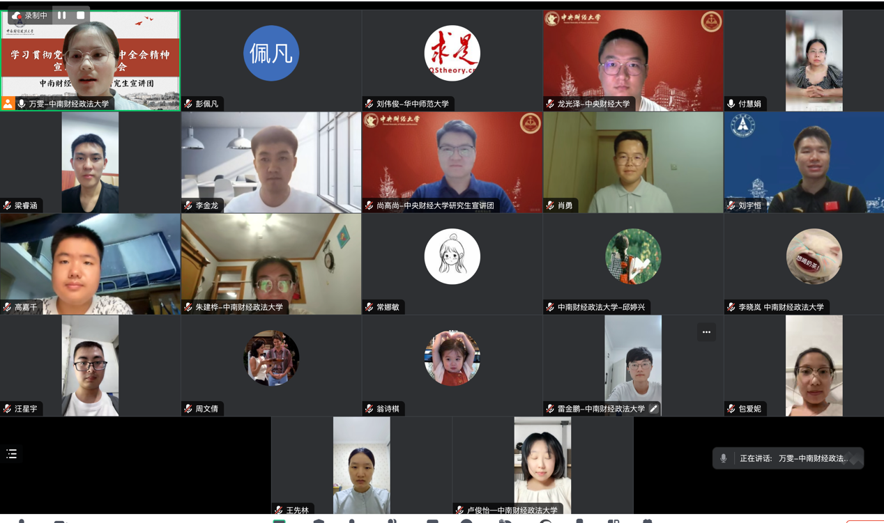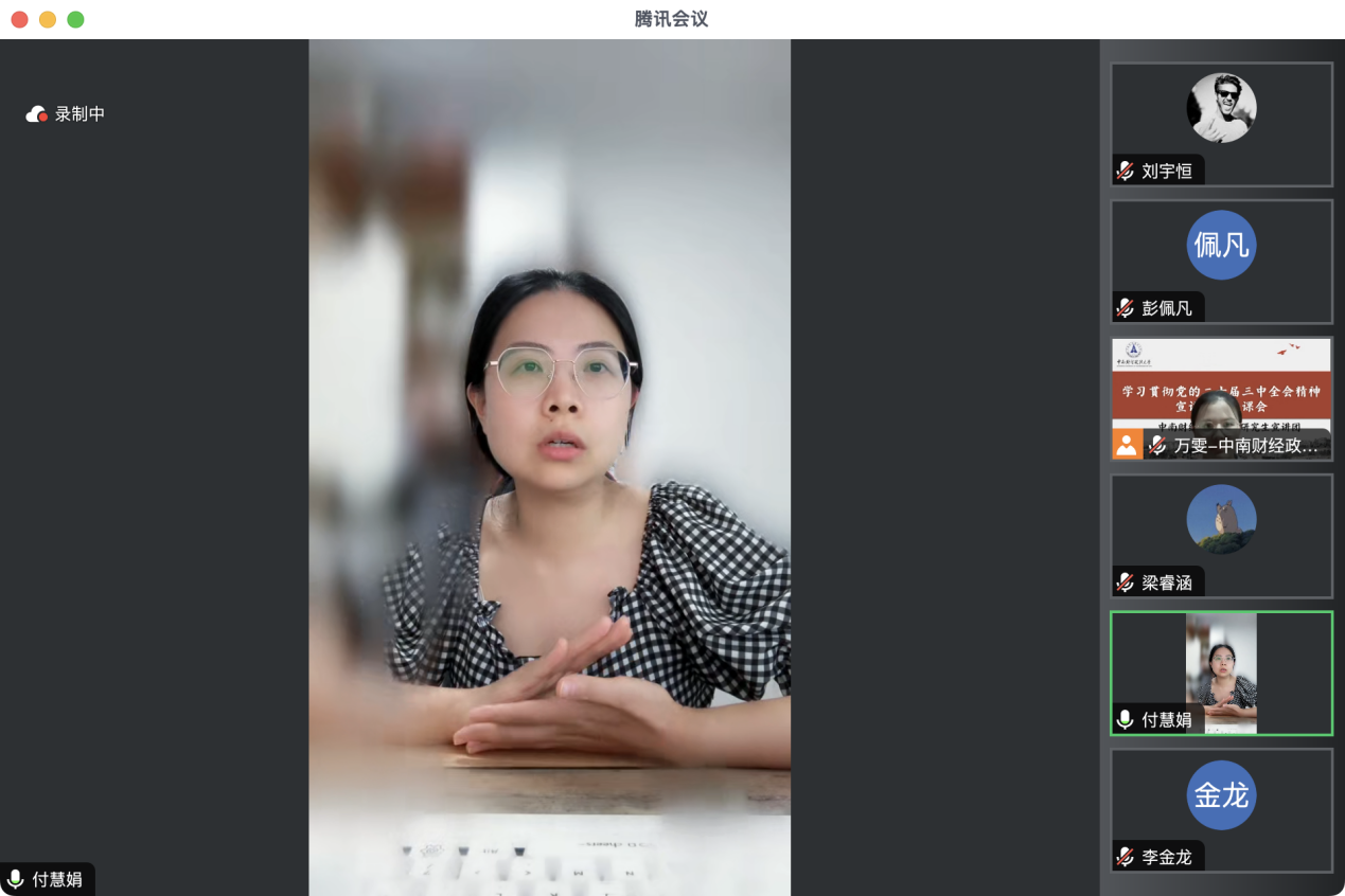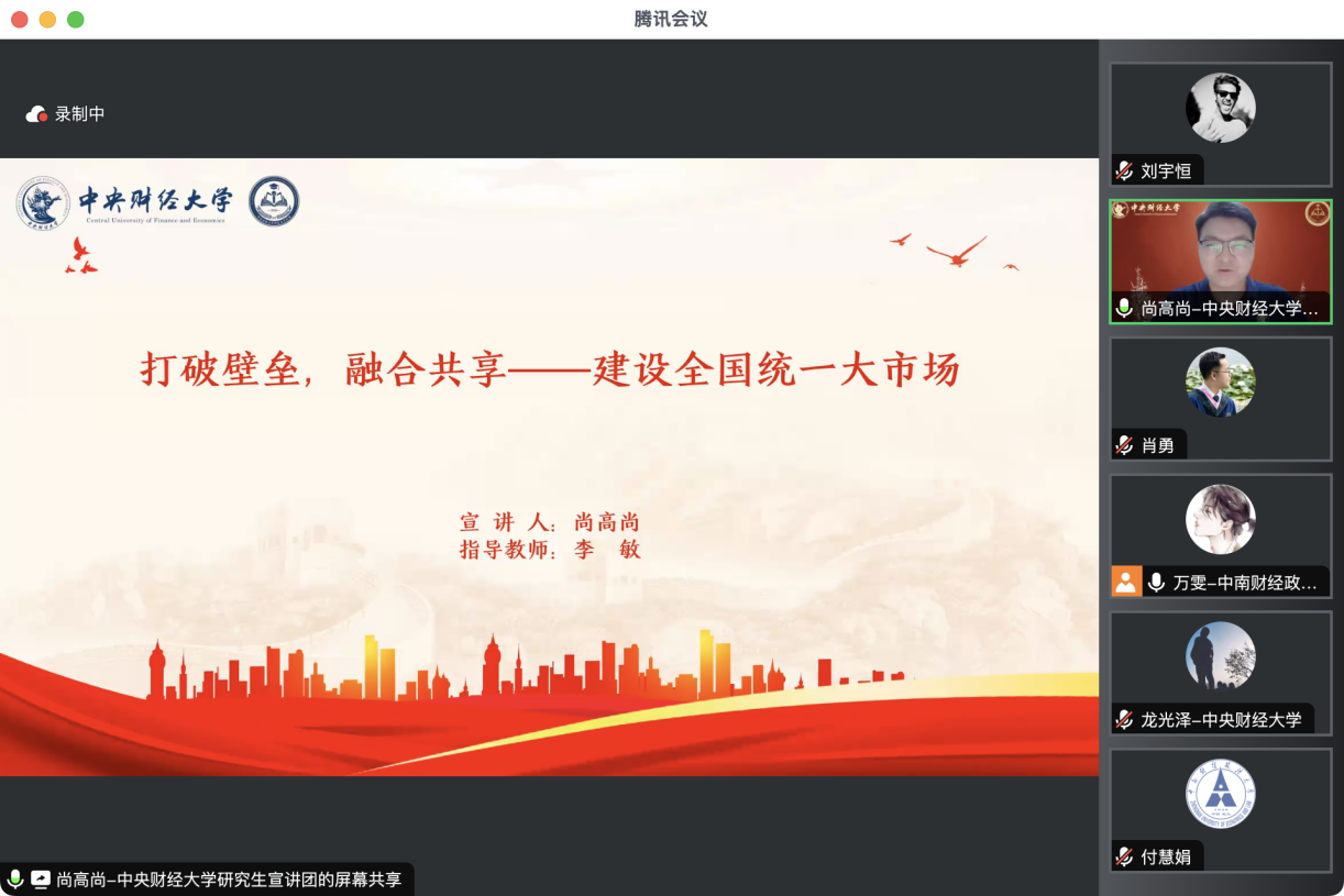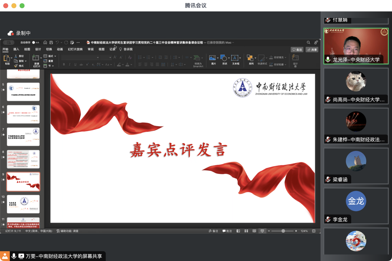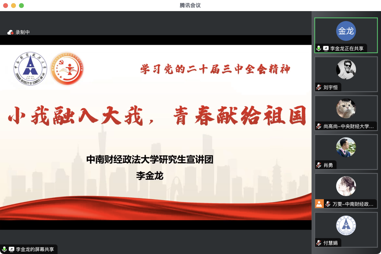 首先,中央财经大学研究生宣讲团副团长尚高尚和中南财经政法大学研究生宣讲团成员李金龙、万雯、包爱妮、刘宇恒、常娜敏六位同志围绕党的二十届三中全会精神作主题宣讲。