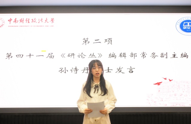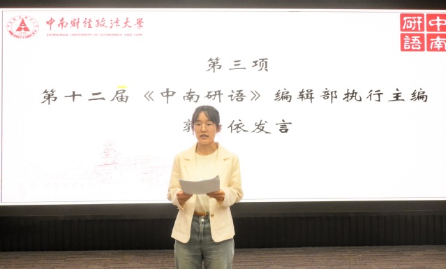 接下来,《中南研语》编辑部执行主编郭怡依发言。她代表《中南研语》编辑部对新成员的加入表示热烈欢迎,并对《中南研语》编辑部的刊物定位、指导思想、组织架构、版块(部门)职责等内容进行了详细介绍和展示。她回顾了《中南研语》自2013年创办以来取得的工作成果,并从坚定理想信念、加强思想引领,坚持质量为先、优化刊物内容,推进团队建设、形成工作合力三个方面对刊物未来的发展方向和工作规划进行了介绍,希望能与新成员们一道,用责任和使命创造属于自己的价值,成为《中南研语》编辑部承前启后、开拓创新的一届。