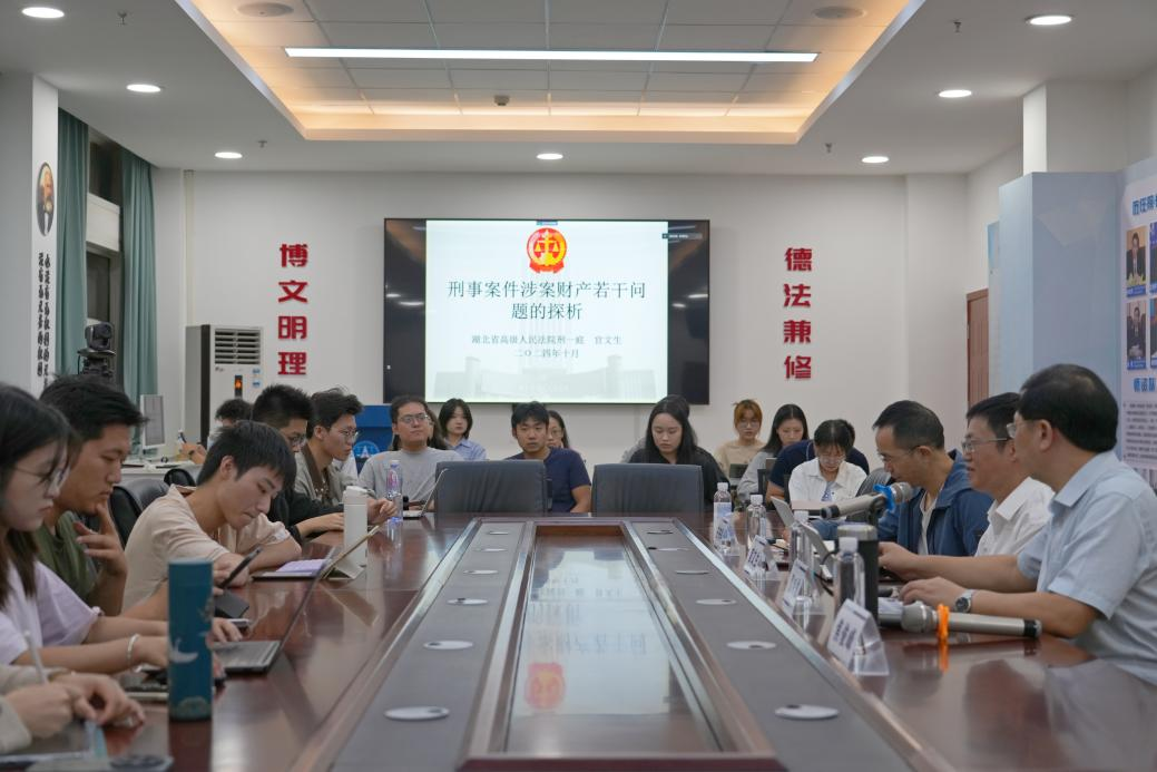 (通讯员:董邦俊 肖思言;摄影:孙惟安)10月16日19时,由中南财经政法大学研究生院、党委研究生工作部、中南财经政法大学研究生会主办,中南财经政法大学刑事司法学院研究生会承办的第314期“文澜大讲堂”之名家讲坛在南湖校区文治楼二楼会议室顺利举行。本次讲座采用线上与线下相结合的方式,以“涉案财产处理研究”为主题,特邀湖北省高院审委会委员、刑一庭庭长官文生主讲,我院副院长董邦俊教授主持,我院党委委员焦俊峰教授、王安异教授出席,部分博士、硕士研究生参加讲座。