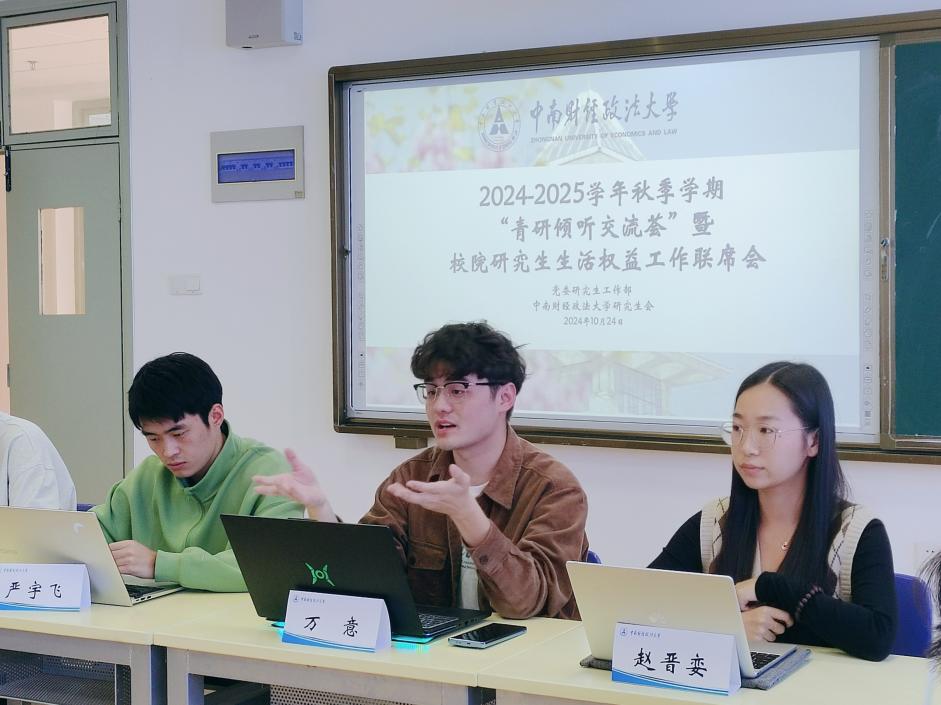 (通讯员 赵晋娈 张宇 金嘉洁 摄影 陈晓然)为切实做好研究生生活权益服务工作,加强校院两级研会间的沟通协作,提升服务质量和效率,2024年10月24日周四中午,校研会生活权益部于文澴502组织召开2024-2025学年秋季学期研究生权益工作联席会议。校研会生活权益部负责人、各学院研会生活权益工作负责人参加会议。