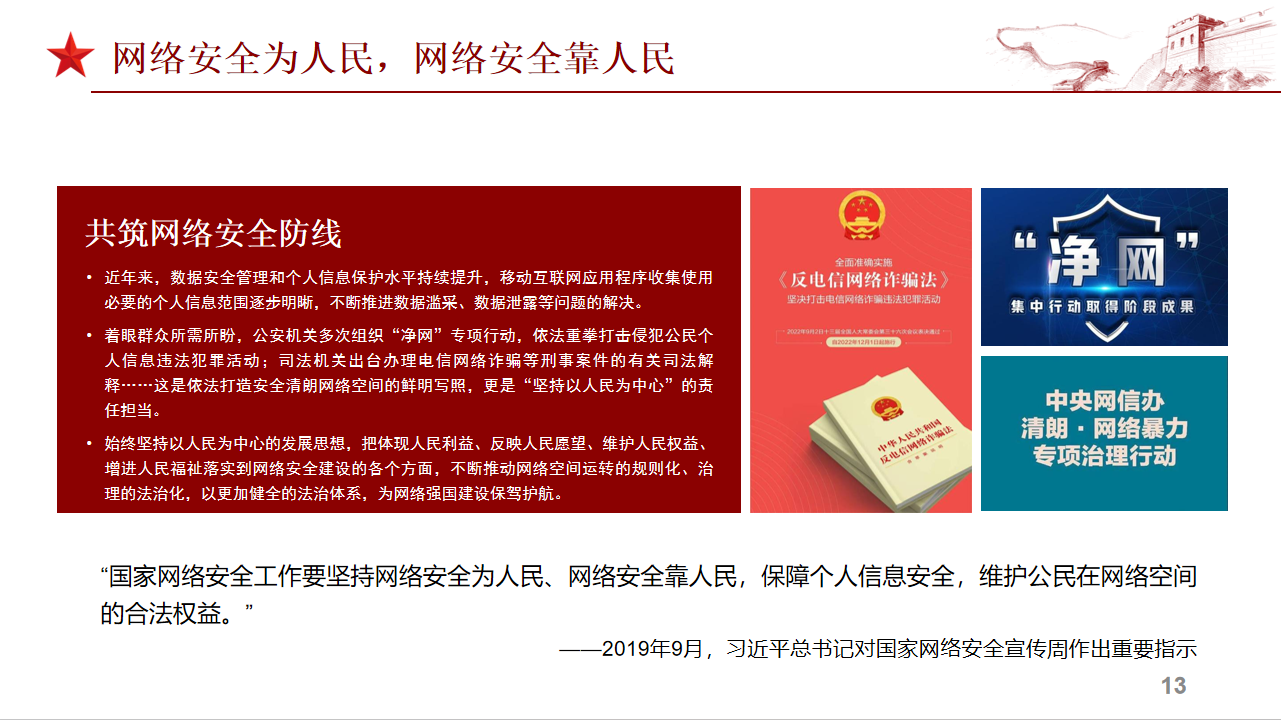 本次党课重点讲解了习近平法治思想形成的理论来源、理论框架、价值核心、总体目标和基本路径等相关内容。习近平总书记指出,网络和信息安全牵涉到国家安全和社会稳定,是我们面临的新的综合性挑战。近年来,我国出台网络安全法、电子商务法、数据安全法、个人信息保护法、关键信息基础设施安全保护条例等法律法规,网络法律法规政策体系基本形成。网络安全等非传统安全是国家安全的重要基石,支部党员深刻意识到,我们必须在习近平法治思想指引下,坚定不移推进网络安全等非传统安全治理,切实维护国家安全。除此之外,大家进一步了解了近年涌现出的高发诈骗手段、网络暴力和泄露个人隐私的相关案件,以现身说法增强防骗意识,养成良好上网习惯。