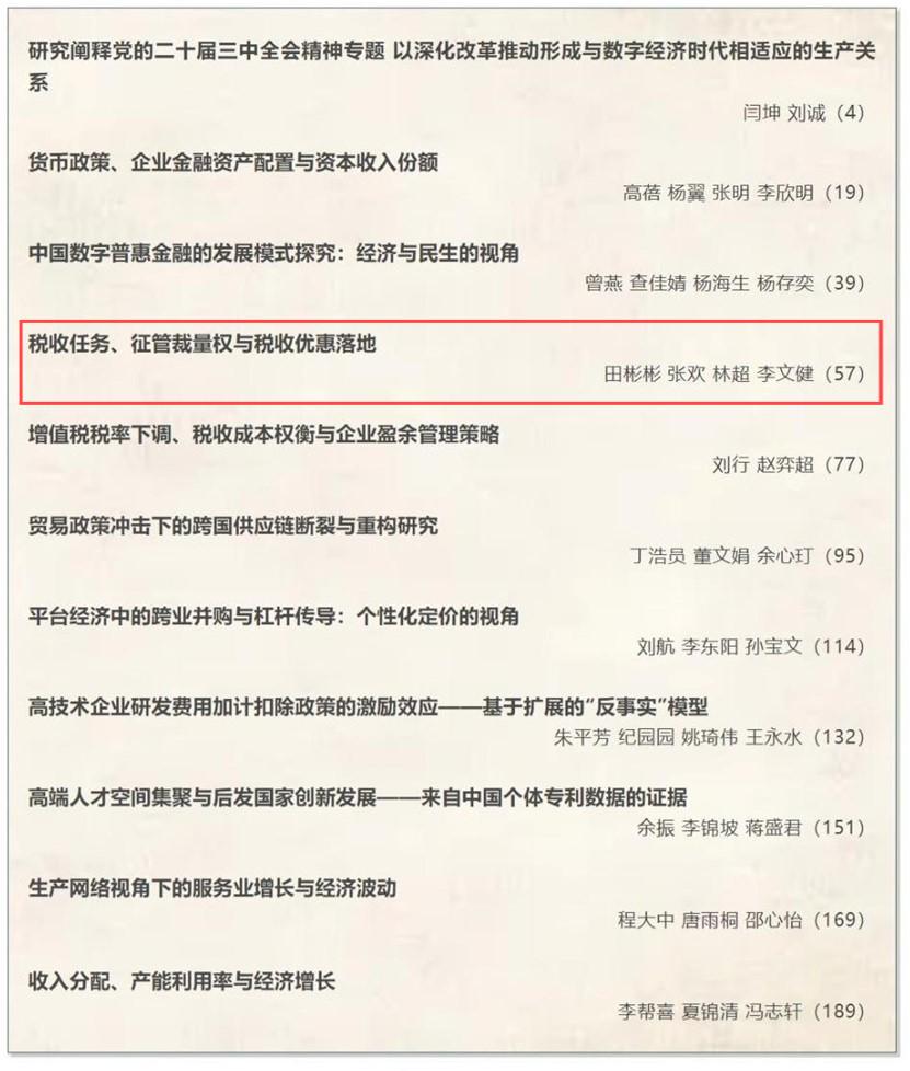近日,财政税务学院2023级博士研究生张欢以二作身份(导师一作)在《经济研究》2024年第8期发表题为《税收任务、征管裁量权与税收优惠落地》的学术论文。