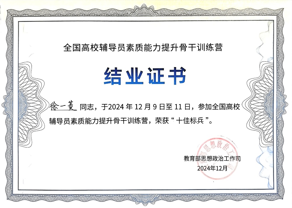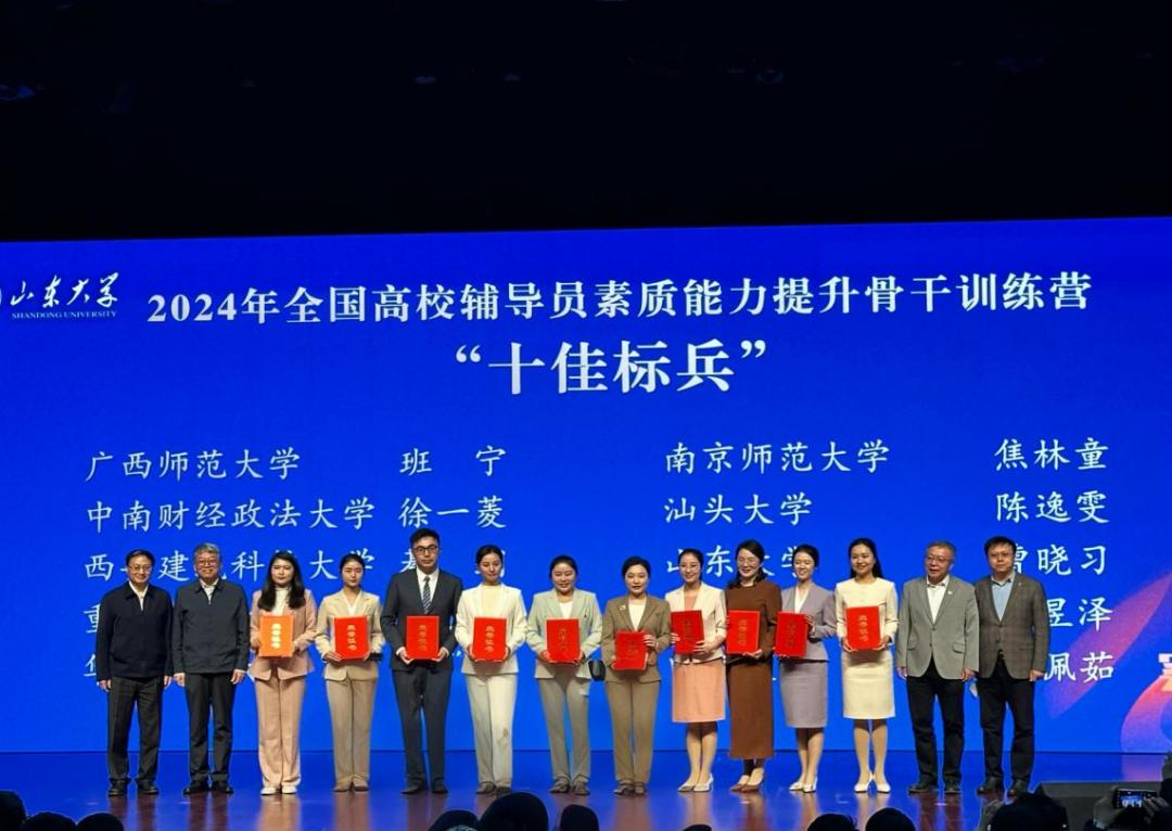 (通讯员 付慧娟 丁娈昕 李秀丽 黄千芷)2024年12月9日-11日,由教育部思想政治工作司主办、中国高等教育学会辅导员工作研究分会承办的全国高校辅导员素质能力提升骨干训练营在山东大学举办,来自全国高校共82名辅导员老师参加。经过遴选推荐,我校工商管理学院研究生辅导员徐一菱作为湖北省高校三位参赛代表之一参加全国训练营,并凭借扎实的理论功底和过硬的综合素质,力压群雄,荣膺全国“十佳标兵”称号,实现学校在该项赛事上历史性突破。