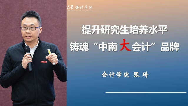 会上,四位与会代表分享了各自的特色与创新经验。会计学院院长张琦展示了学术学位和专业学位的分类培养模式,重点介绍了“科研+课程+管理”与“教学+导师+基地”的培养特色。法学院院长陈柏峰从三个方面分享了如何通过全过程监管提升法治人才培养的质量,取得了显著成效。文澜学院院长龚强介绍了贯通式拔尖创新人才培养模式,强调课程体系建设、学术创新及国际交流的深度融合。导师代表工商管理学院刘凯老师则分享了“五位一体”案例教学体系,推动研究生教育高质量发展的先进经验。